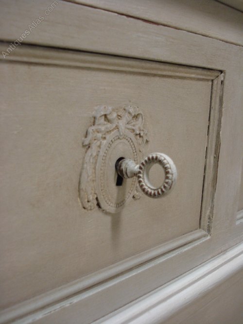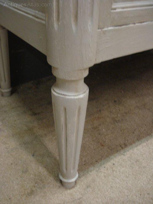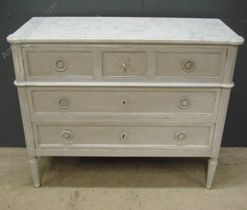 Ref 5855 - Worn pale grey over white painted French Louis XVI style commode chest of drawers. Three drawers with original working locks. Original shaped white/grey figured marble top. Original handles. Circa 1960.