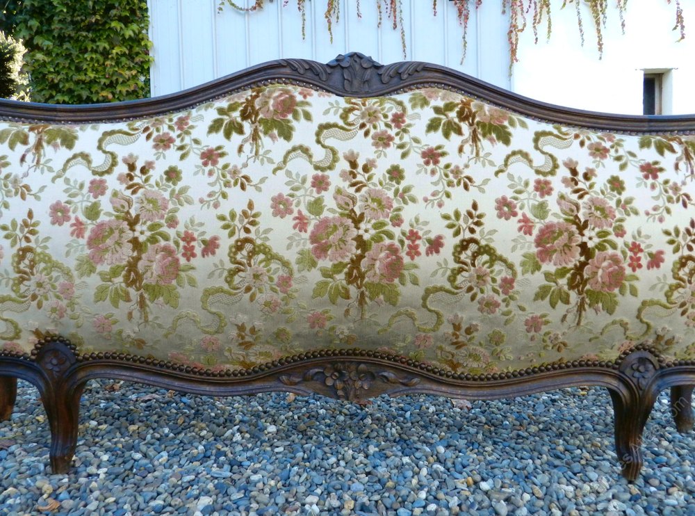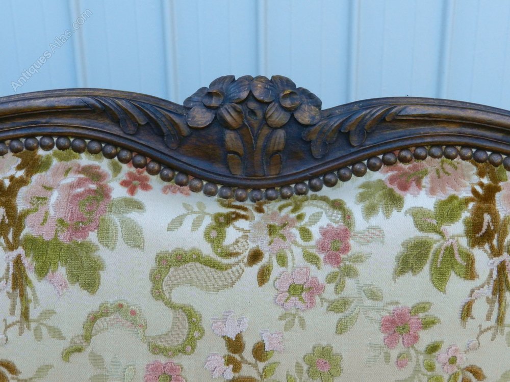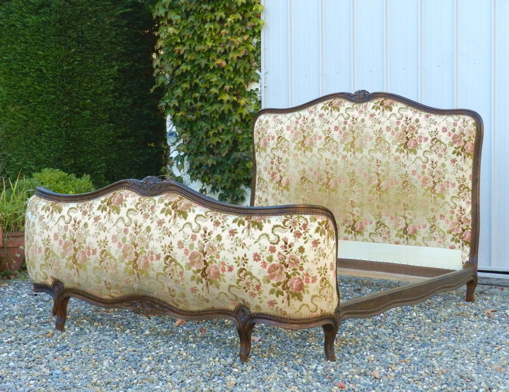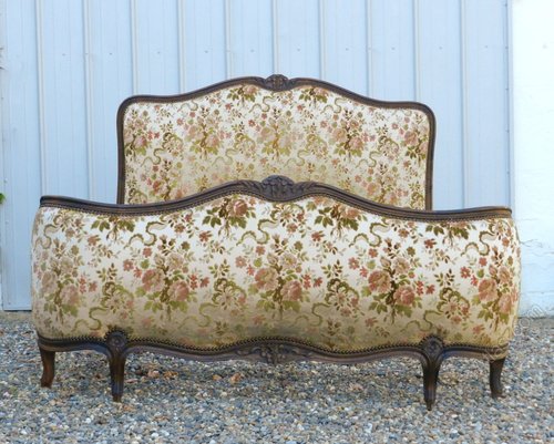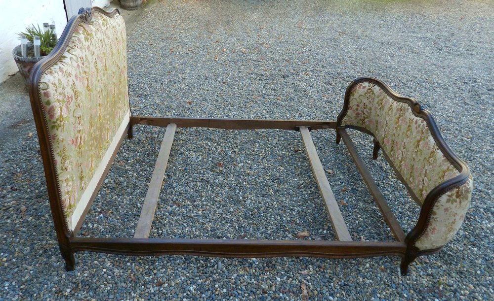 This French Demi Corbeille Bed is upholstered in an attractive floral design material with pink and green velour to both the head and foot boards. These are fixed in place with bronzed domed upholstery pins.