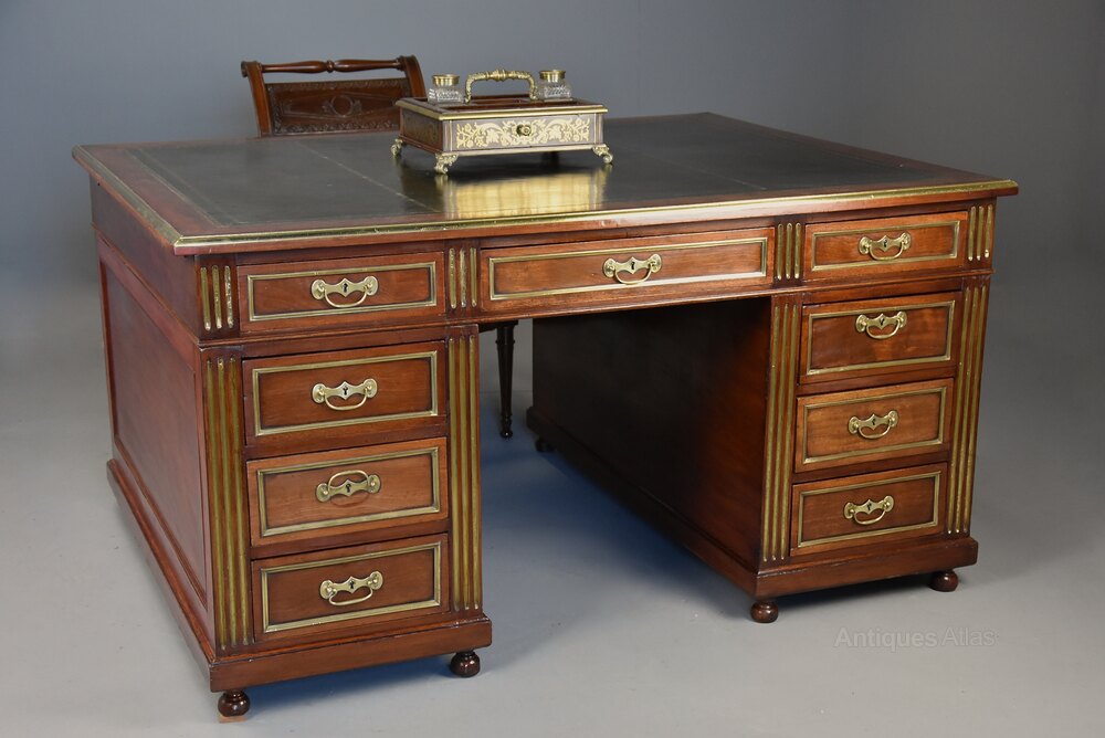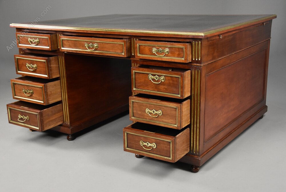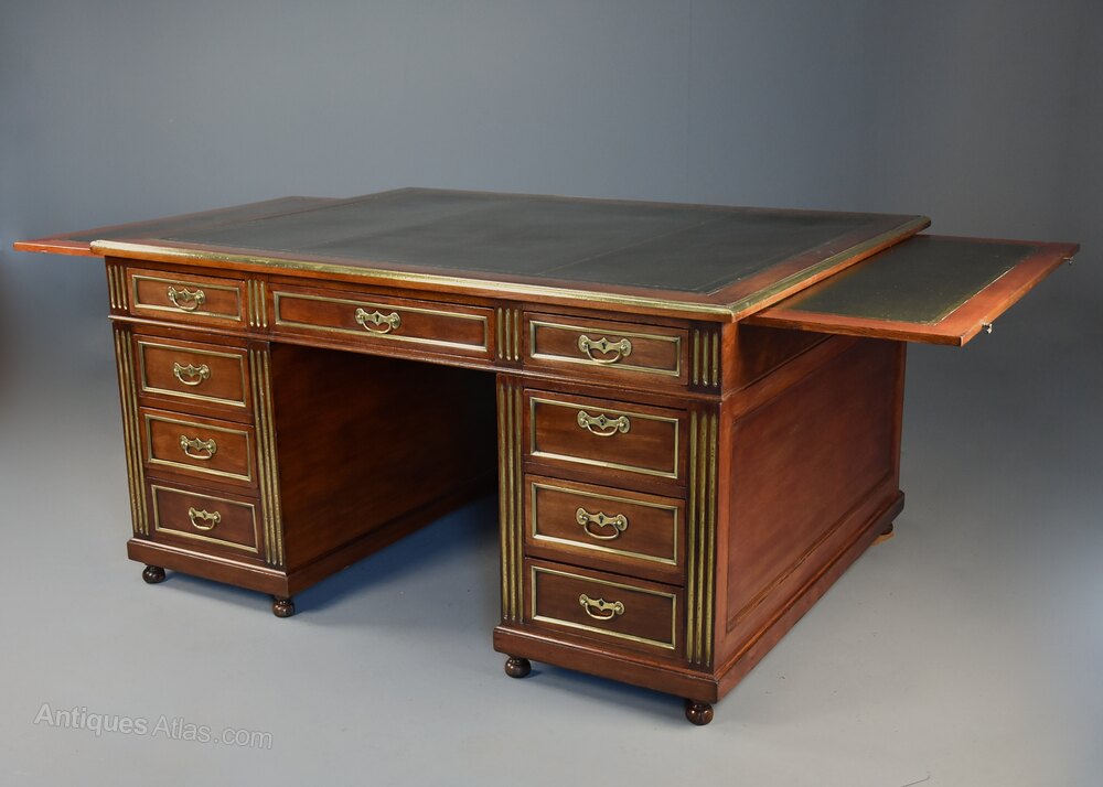 This highly decorative partners desk consists of a rectangular top with green gilt tooled leather writing surface with mahogany banding leading down to a brass moulded edge.