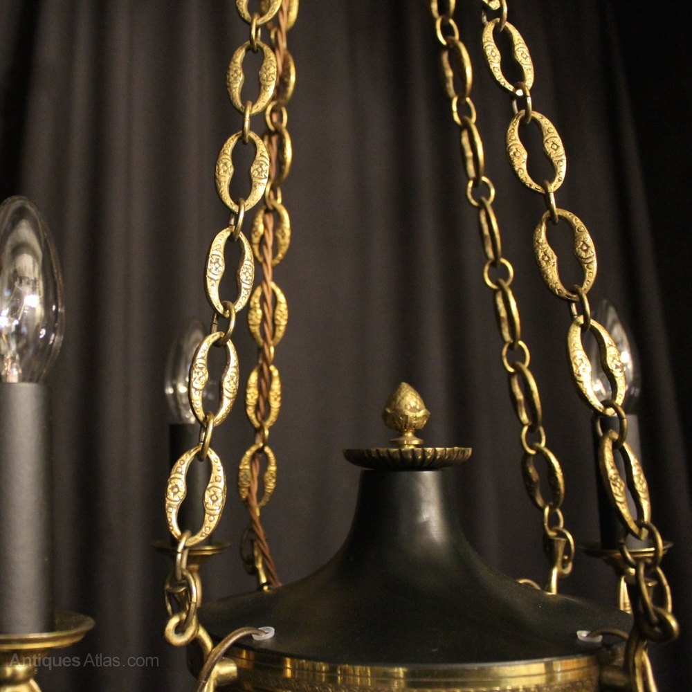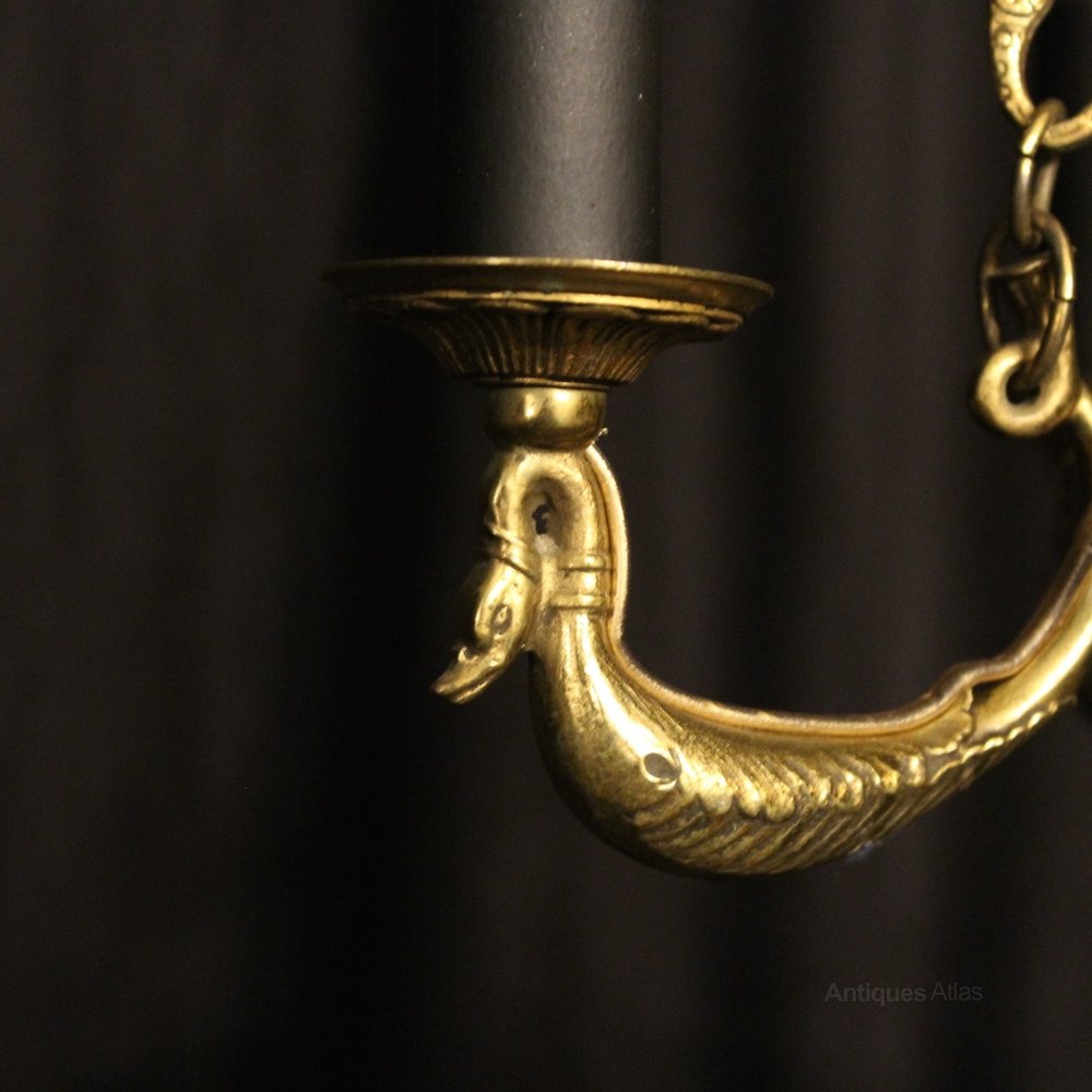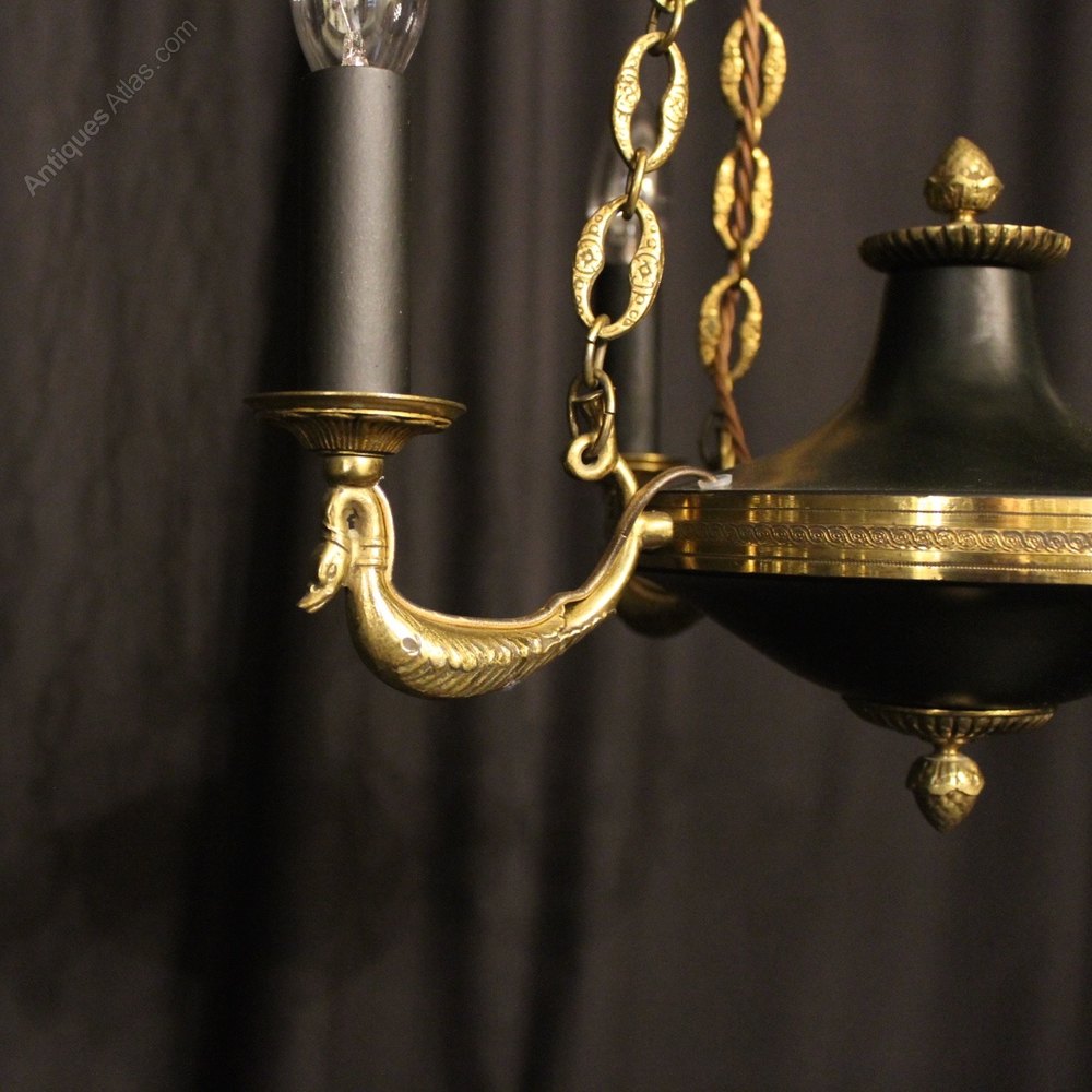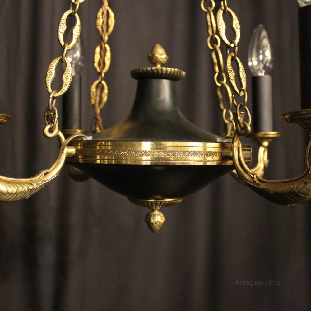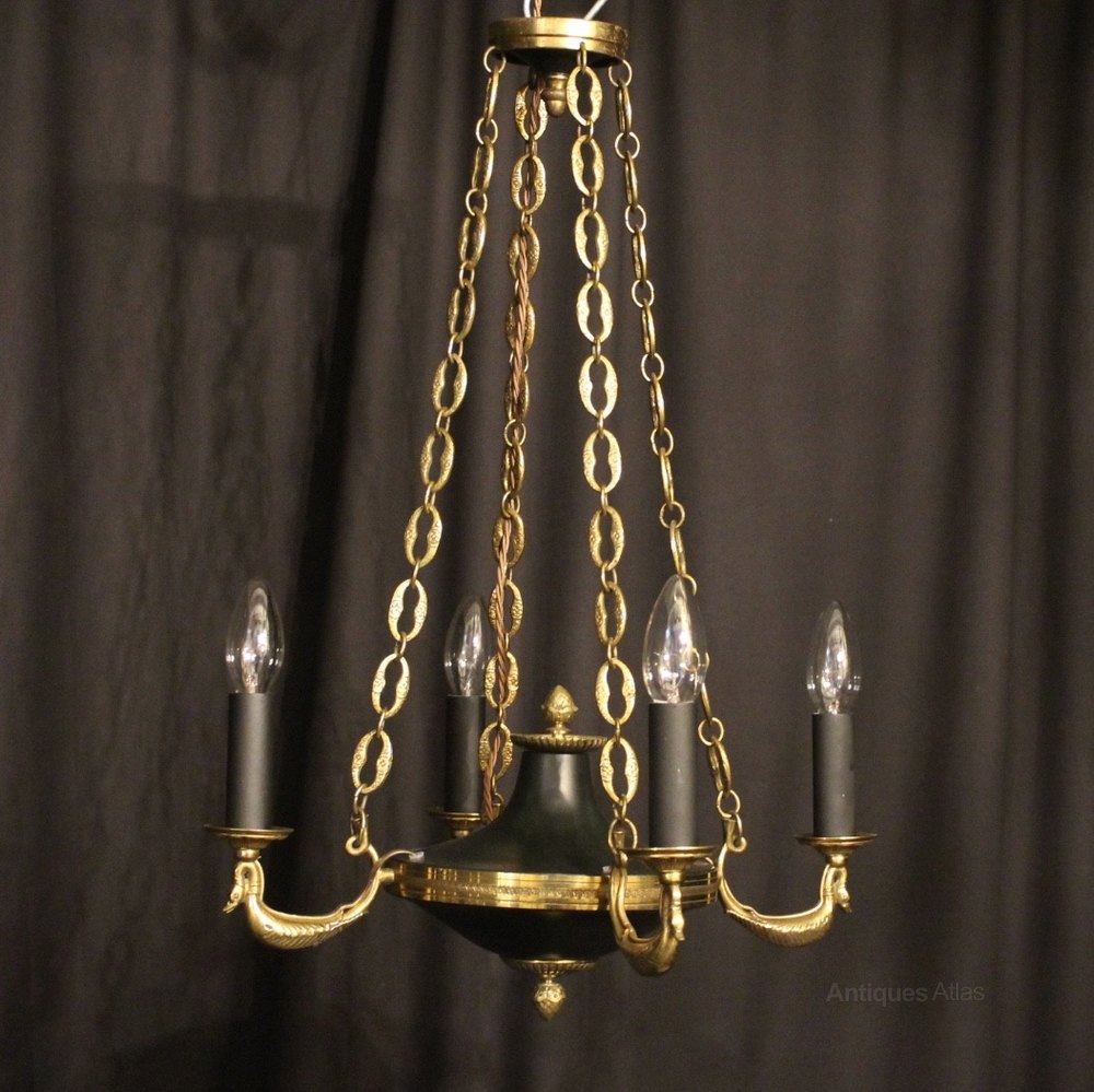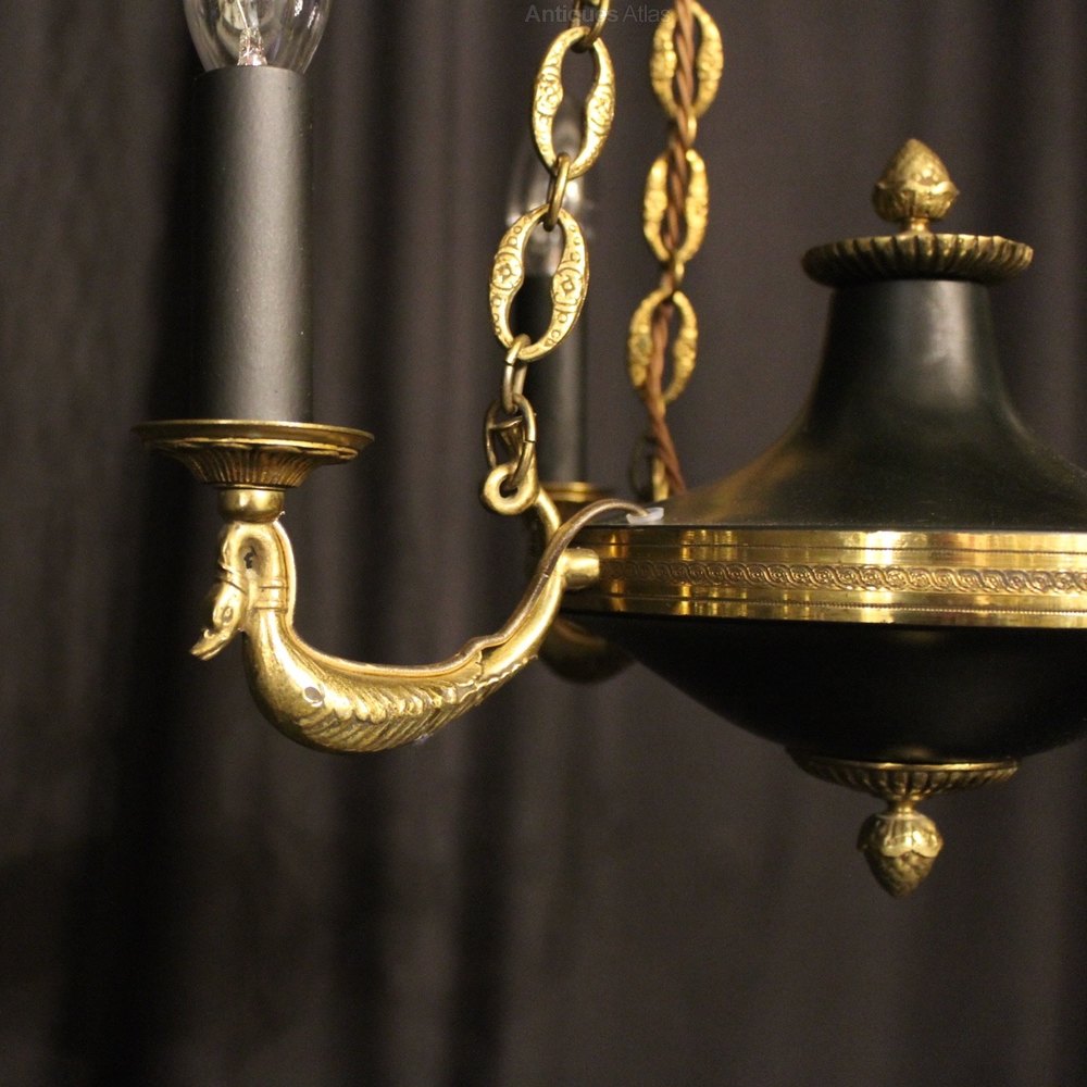 A French Empire gilded cast brass and black enamelled 4 light antique chandelier, the decorative winged swan scrolling arms, issuing from a decorative etched circular band with acorn base, acorn centre finial and black enamelled centre, with the original chain, good scale and nice form. Fully rewired and PAT tested. All our chandeliers come with ceiling fixings and spare bulbs.
