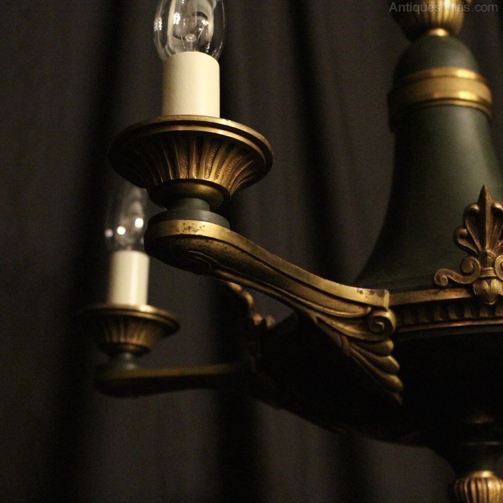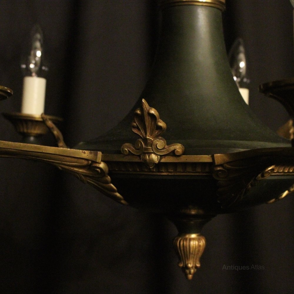 A French Empire gilded cast brass and green enamelled 5 light antique chandelier, the Anthemion arms with circular reeded bobeche drip pans, issuing from a decorative anthemion circular band with ornate end terminal, having the original chain and ceiling rose, good scale and nice form. Fully rewired and PAT tested. All our chandeliers come with ceiling fixings and spare bulbs.