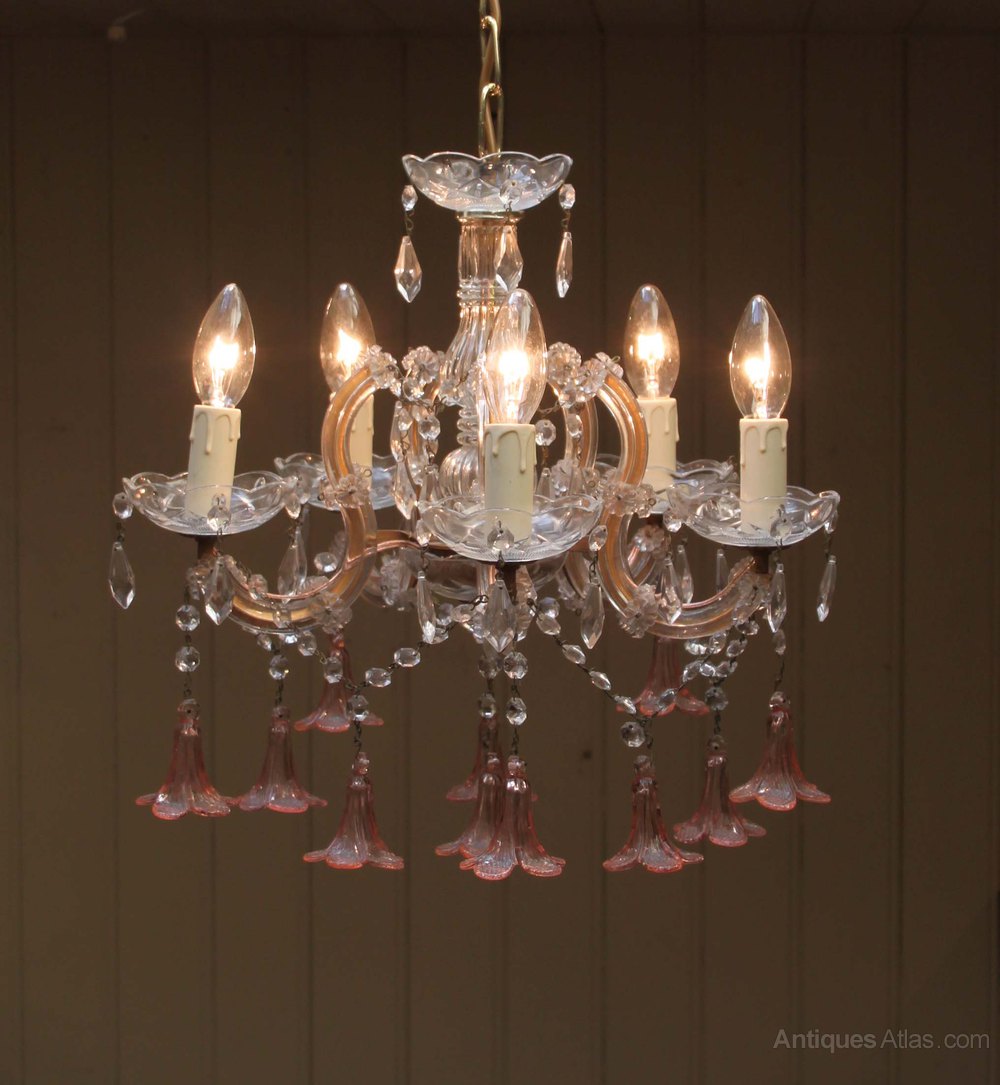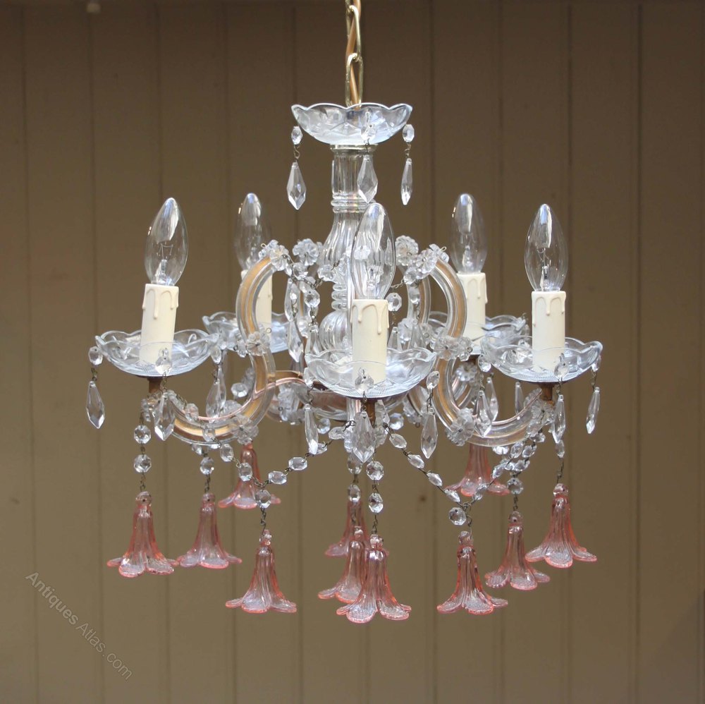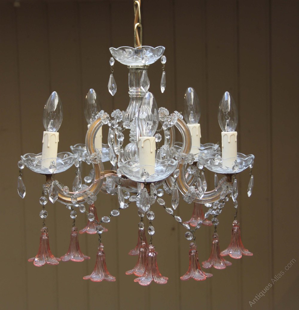 French five branch cut glass chandelier having clear glass beads and drip trays with pink bell shaped floral drops.