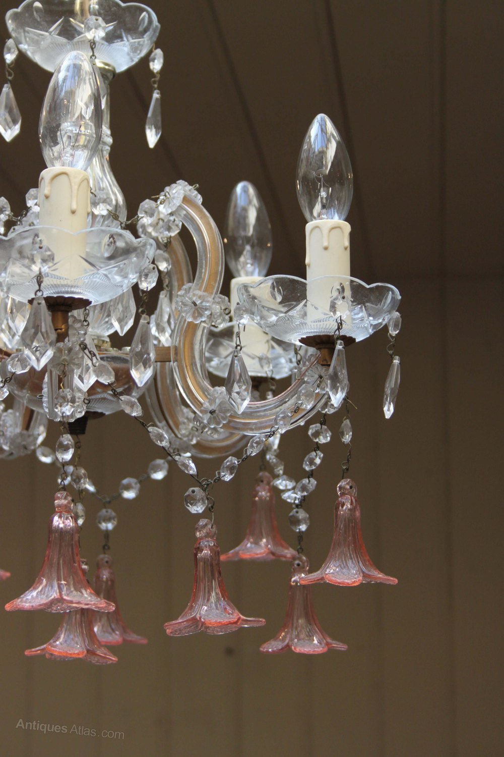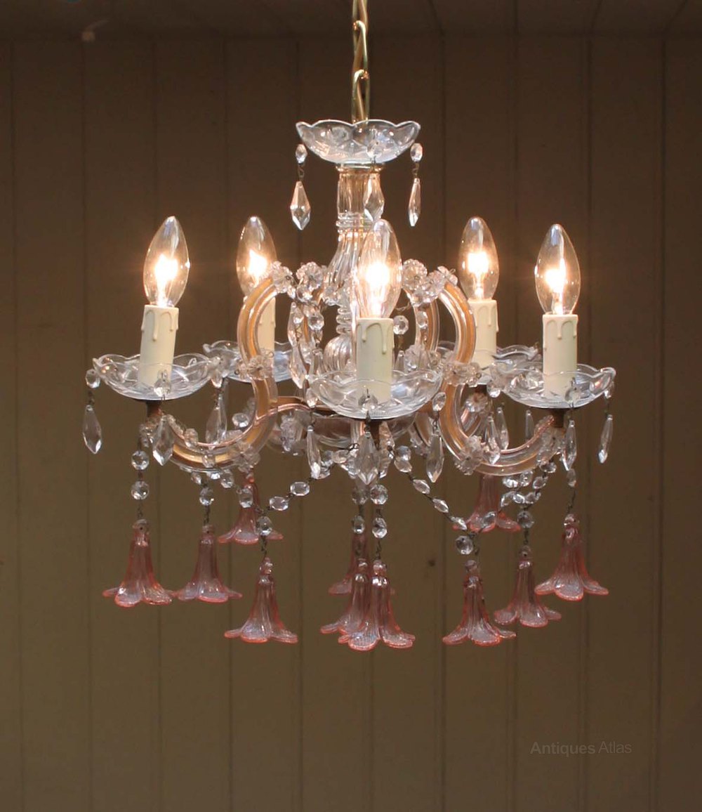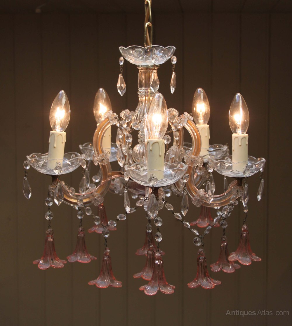 French five branch cut glass chandelier having clear glass beads and drip trays with pink bell shaped floral drops.