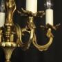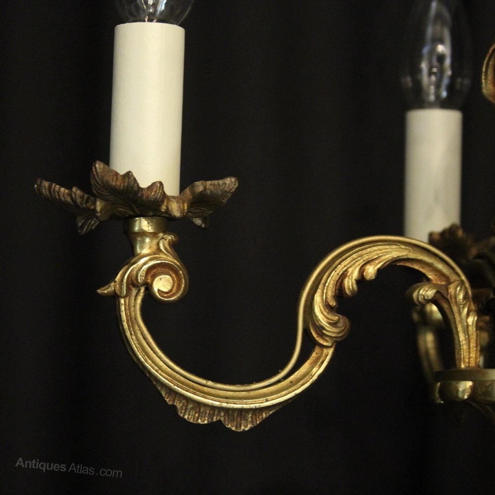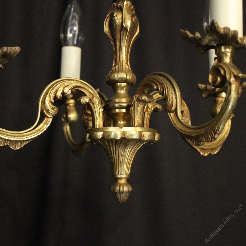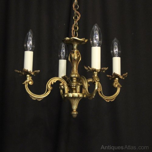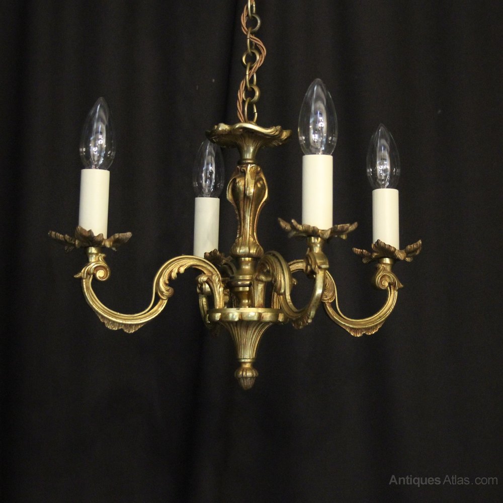 A small French gilded brass 4 light antique chandelier, the scrolling leaf clad arms with leaf bobeche drip pans, issuing from an ornate bulbous central column, having the original chain and ceiling rose, with original gilded patination and nice small size. Fully rewired and PAT tested. All our chandeliers come with bulbs and ceiling fixings.