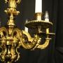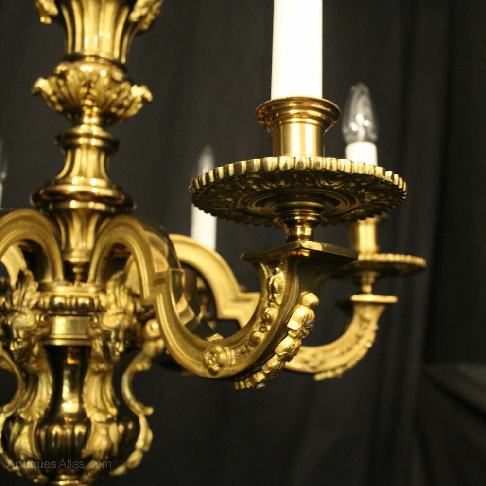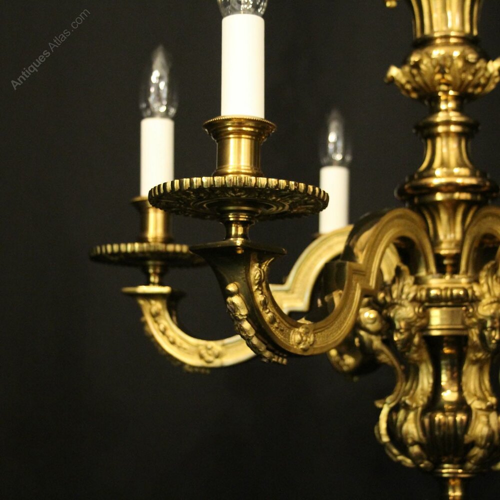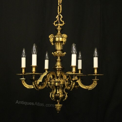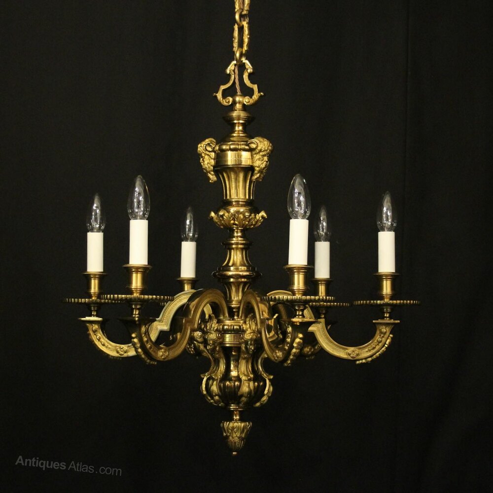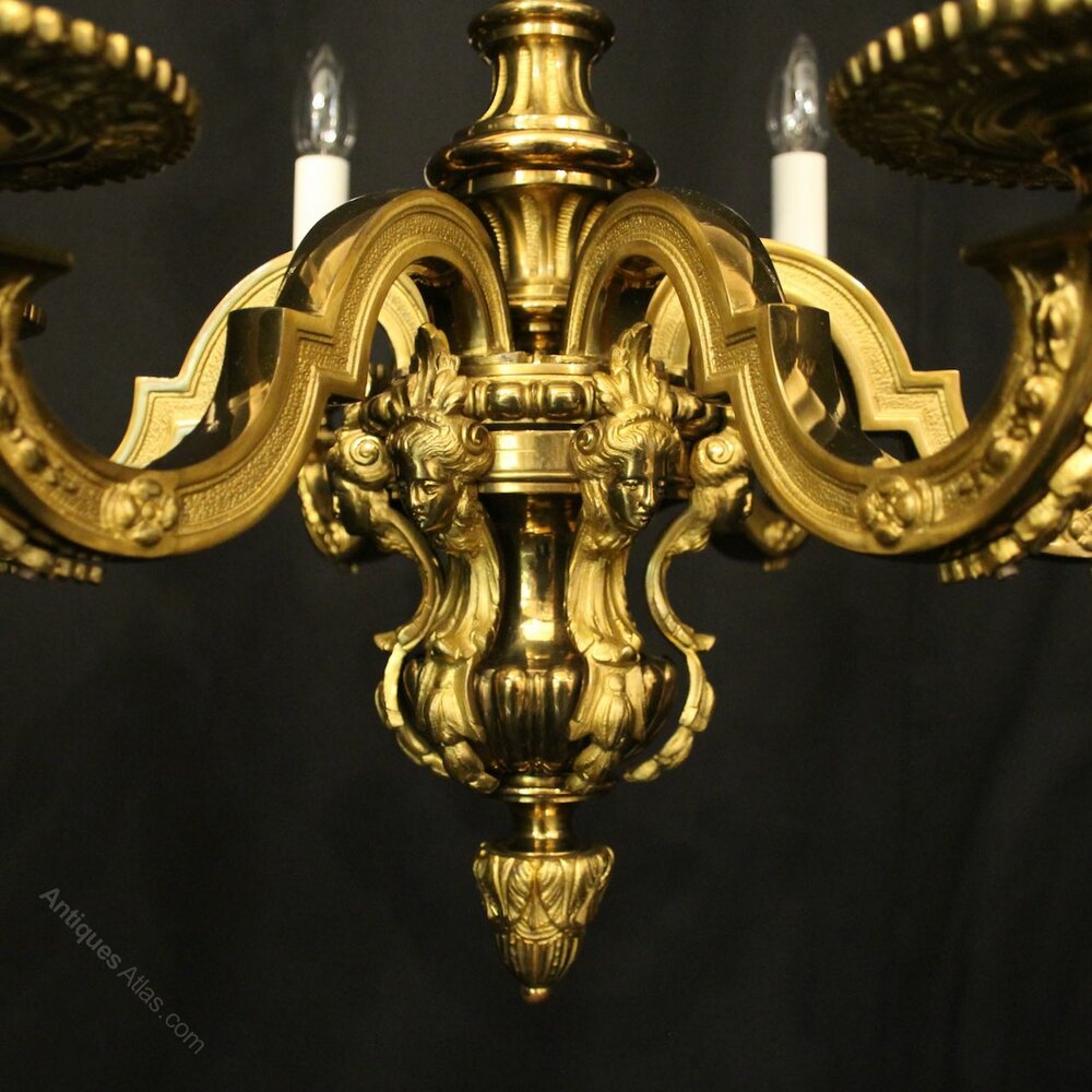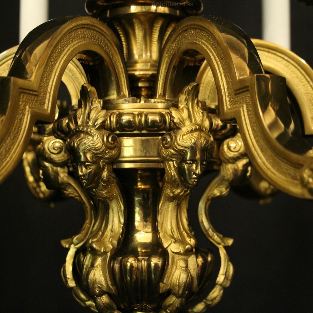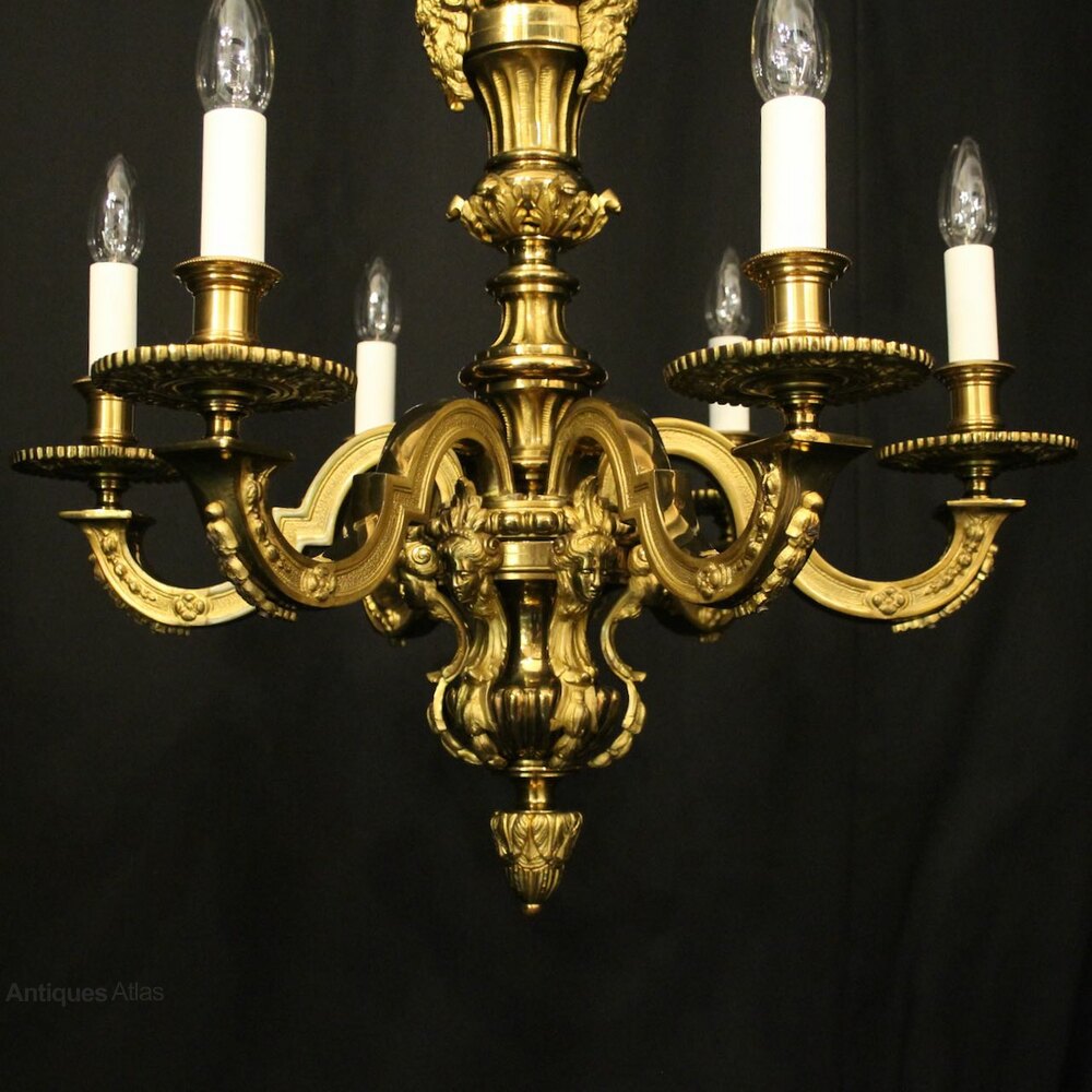 A French gilded bronze 6 light Mazarin antique chandelier, the square gauge leaf clad scrolling arms with circular millgrain bobeche drip pans and banded candle sconces, issuing from an tapering central column with three bearded Bacchic headed embellishments set below with decorative Minerva heads and leaf base, excellent original gilded patination and great quality crisp casting. Fully rewired and PAT tested. All our chandeliers come with bulbs and ceiling fixings.