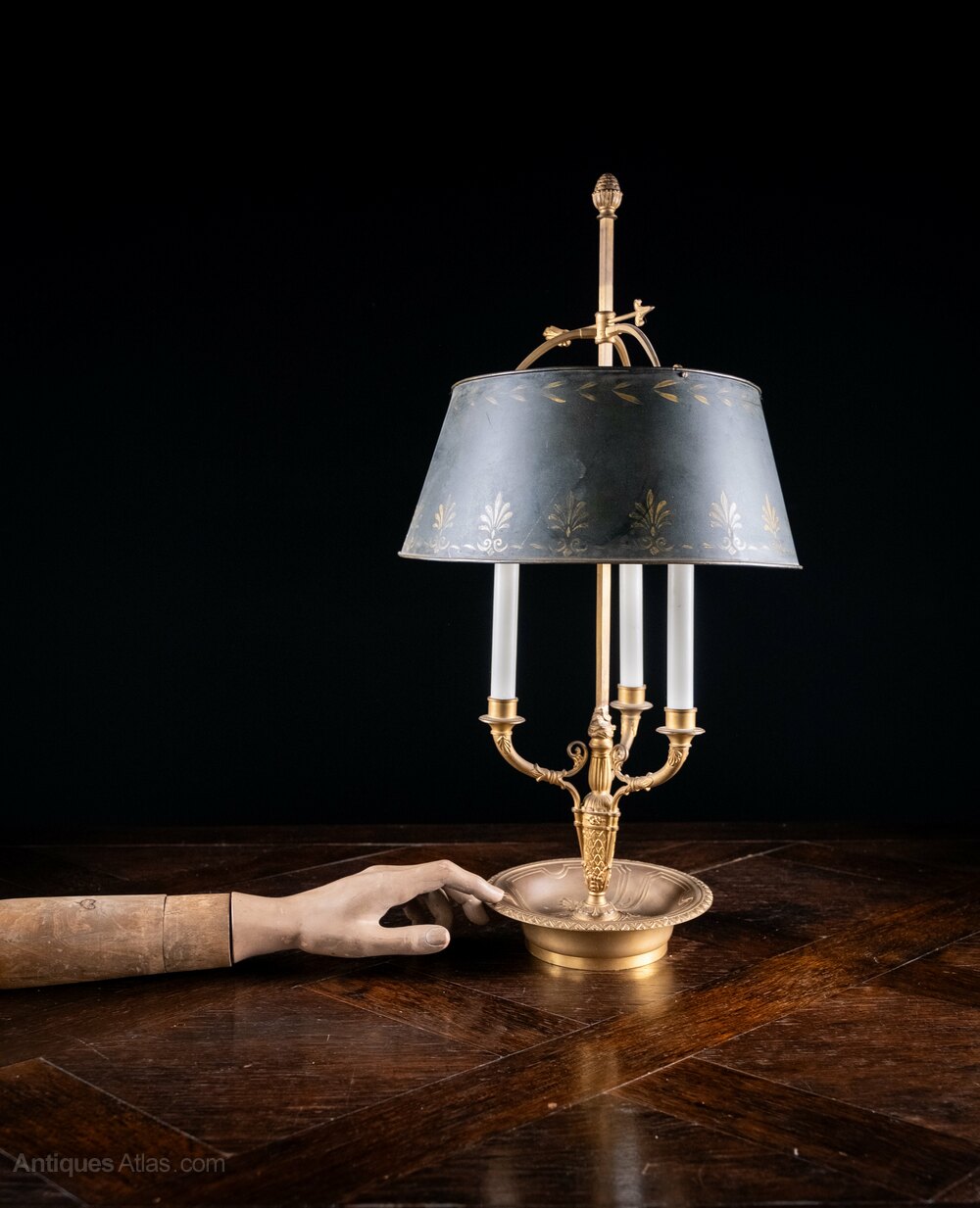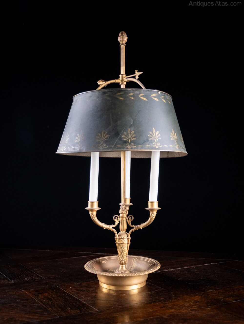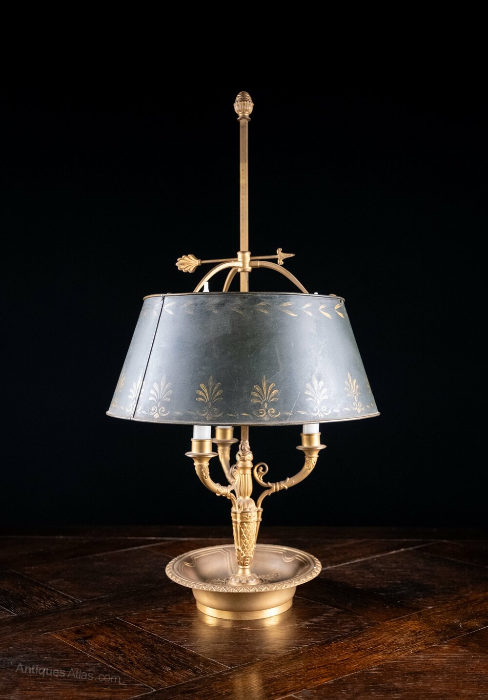 The three neoclassically decorated branches rise above a concave dish with an athemion ornament. The square shaft and further athemion ornament rise to a fully adjustable parcel-gilt and green toleware shade decorated with palmettes.