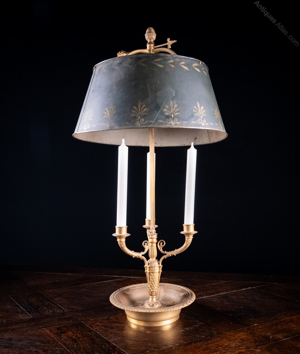 A french gilt brass bouillotte candle lamp, circa. early 20th century. Currently with three wick candles but drilled holes are present for electric (please see photographs).