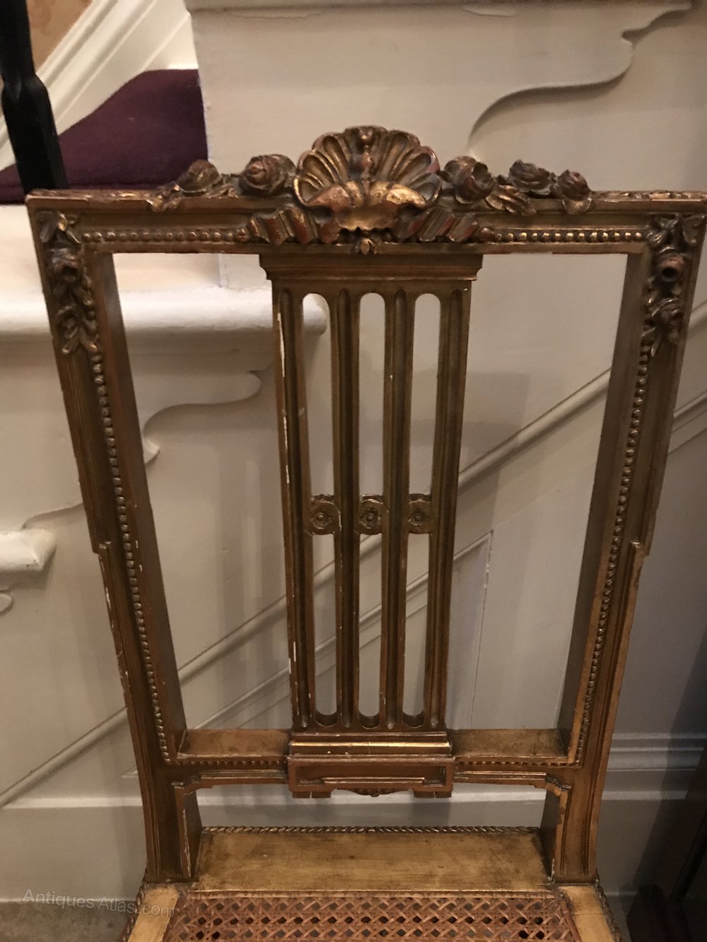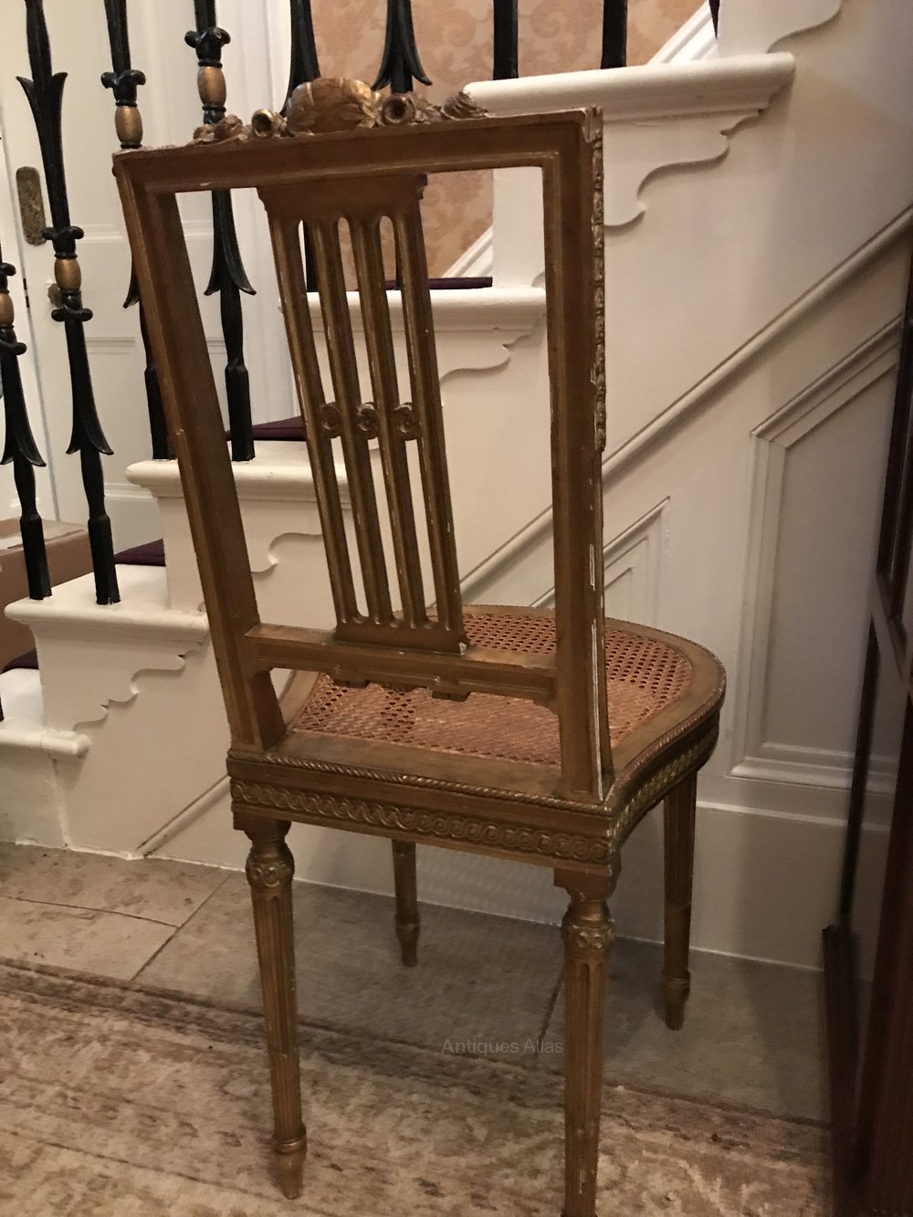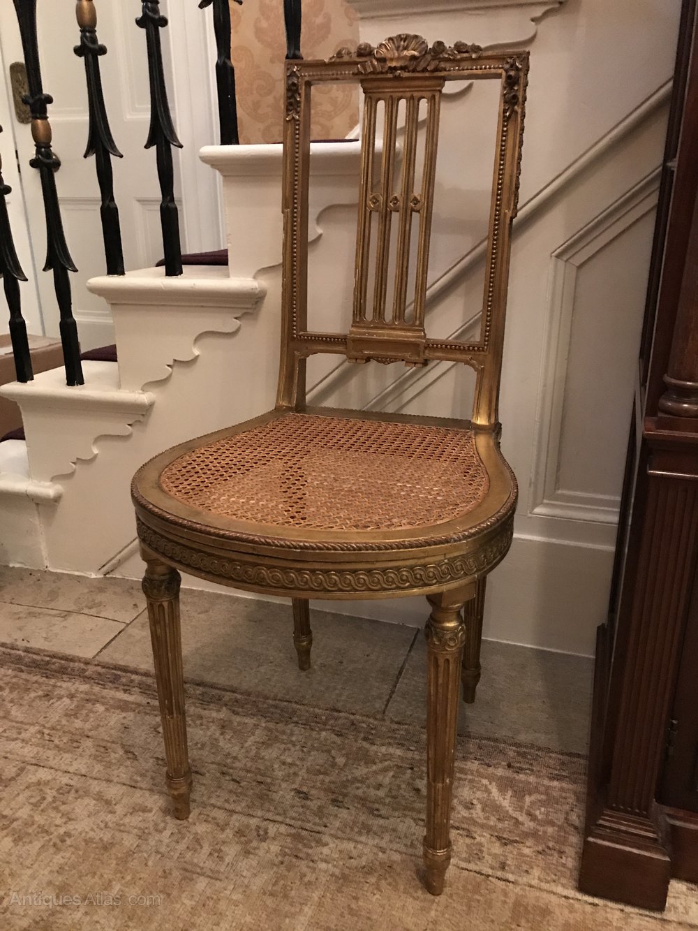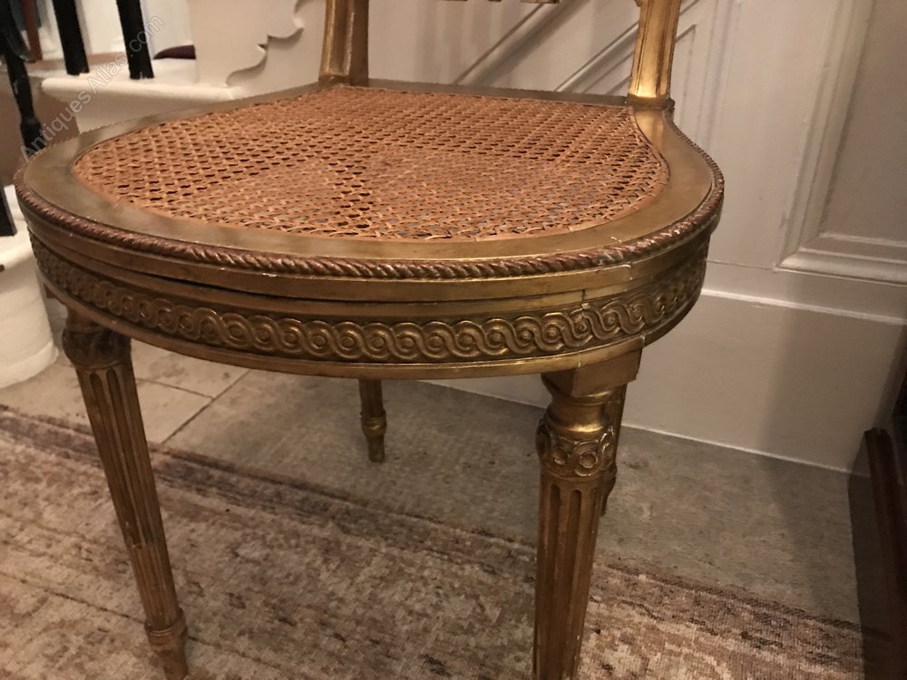 A late 19th century French gilt wood salon chair with rattan cane seat. Carved detail to back. The seat is in excellent condition. A really lovely chair overall.