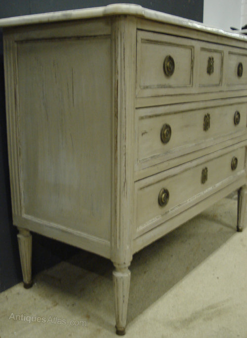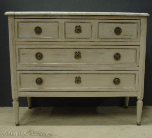 Ref 4002 - Louis XVI style distressed grey painted marble top commode. Three long drawers. Original brass fittings. Original marble top. Circa 1950.