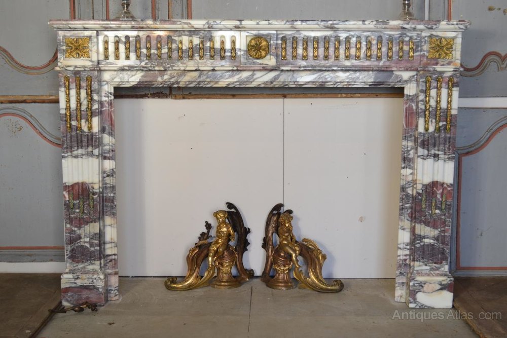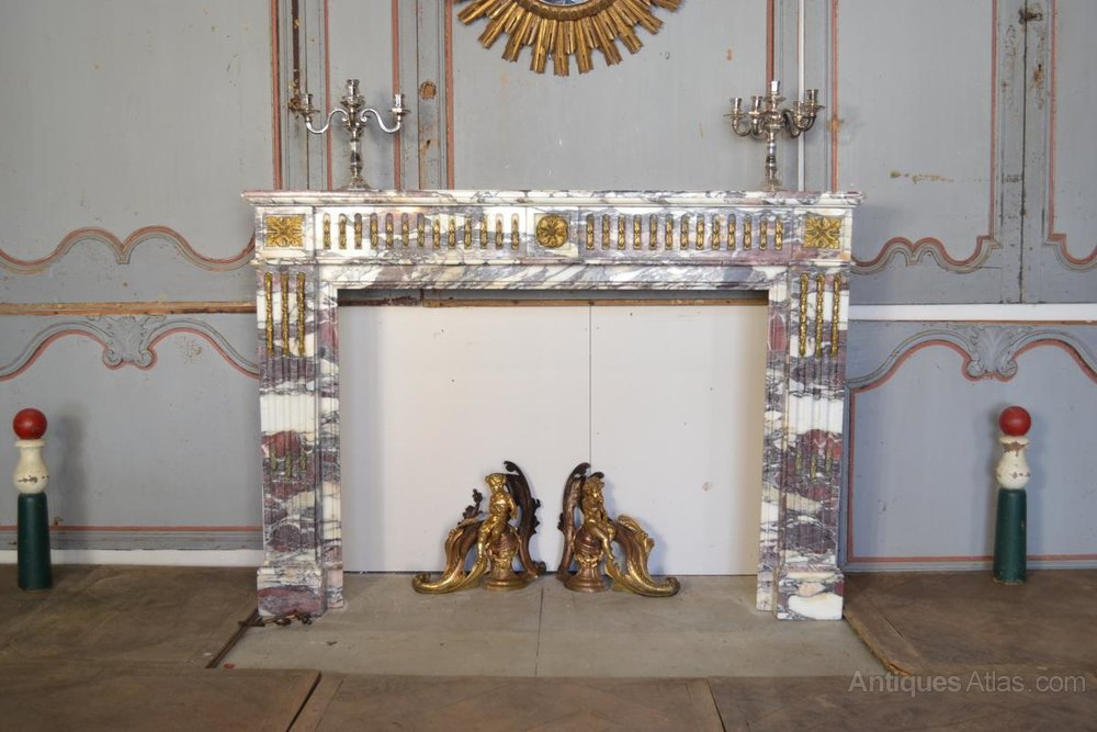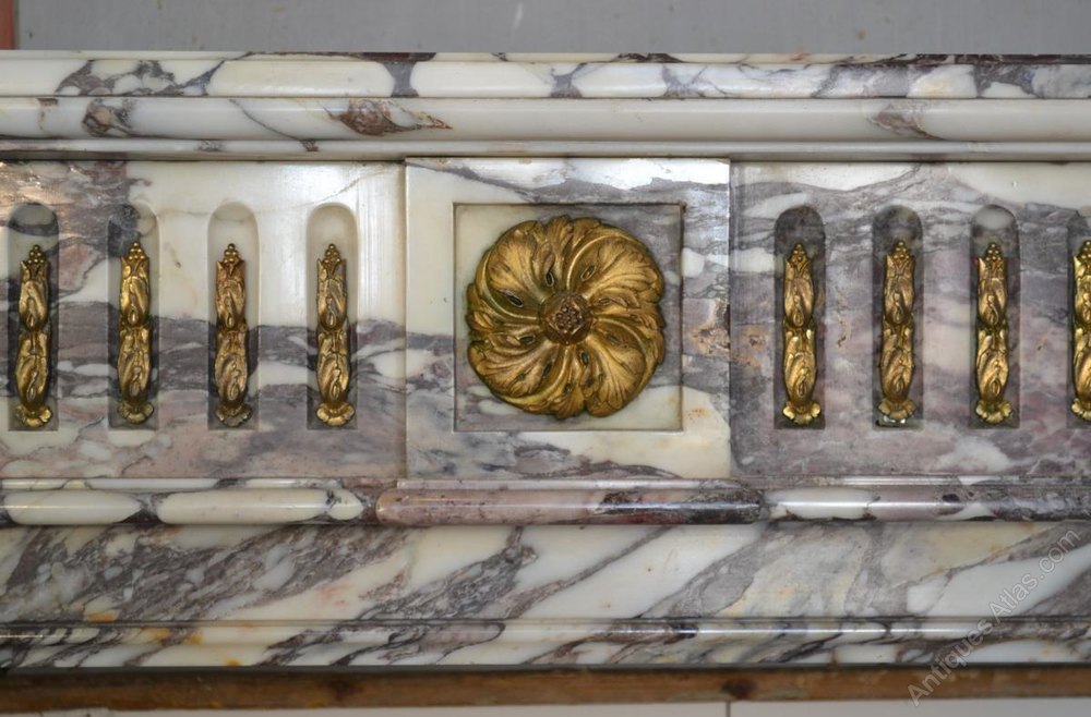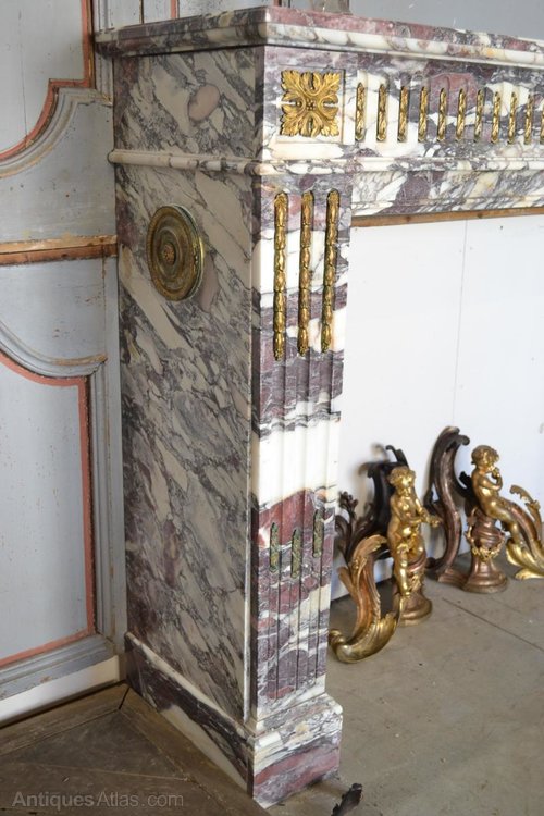 Large marble fireplace breach violet, amounts and grooved rails that are fluted by flames decor bronzes. In the center of the traverse and the top of the amounts a decor of rosettes stylized. Top with indelible ink stain and wear to gilding. Style Louis XVI, era Napoleon III late 19th century.