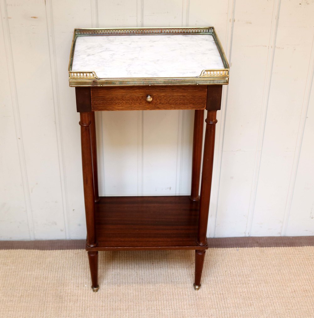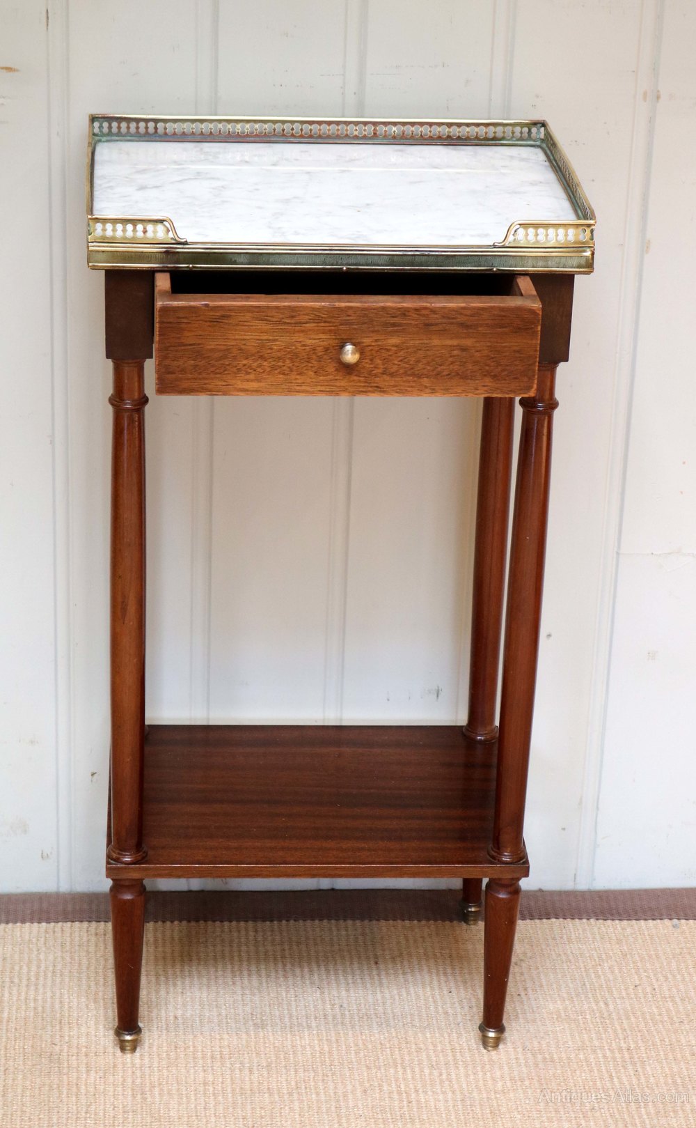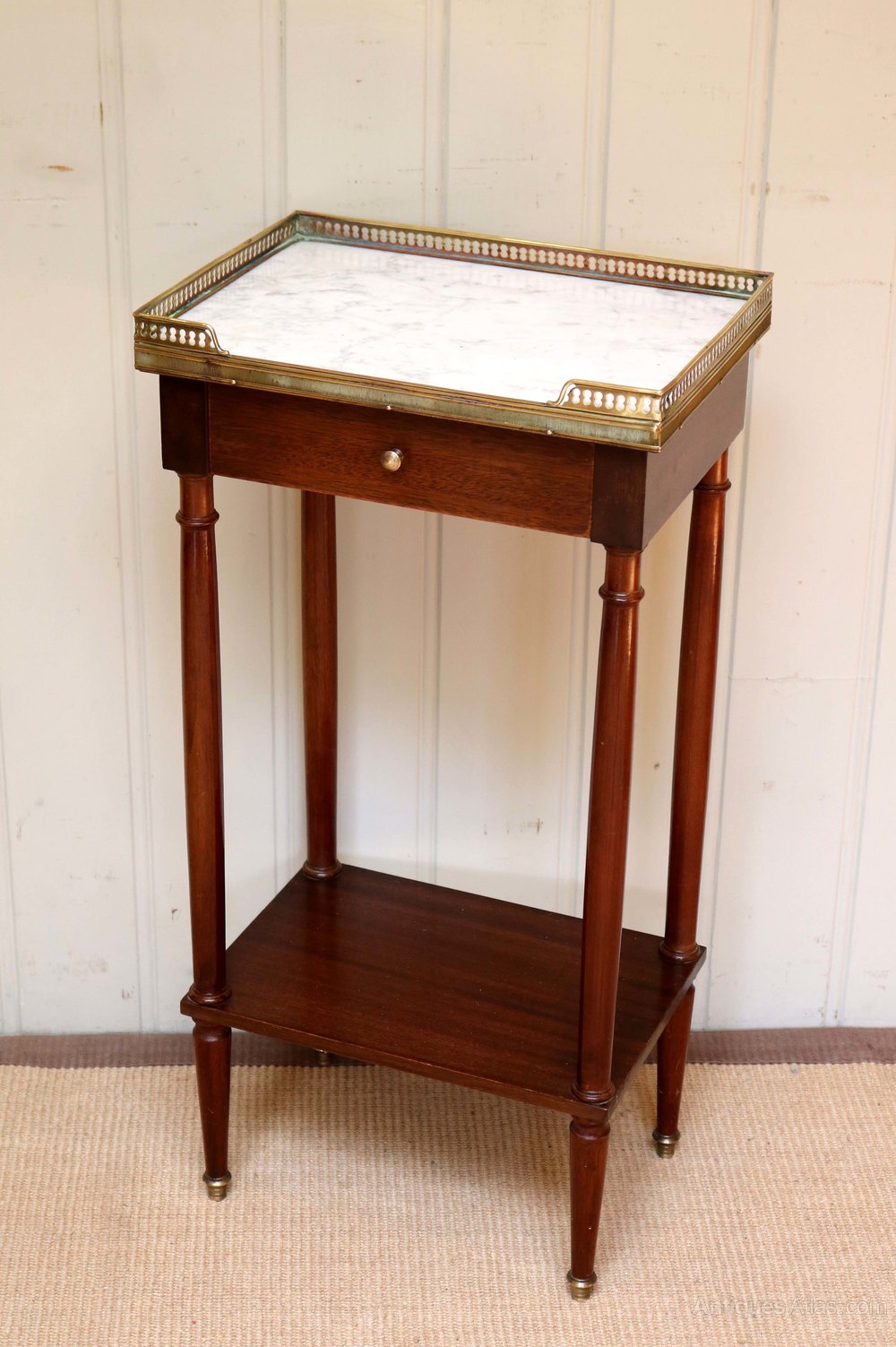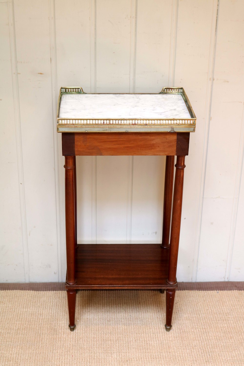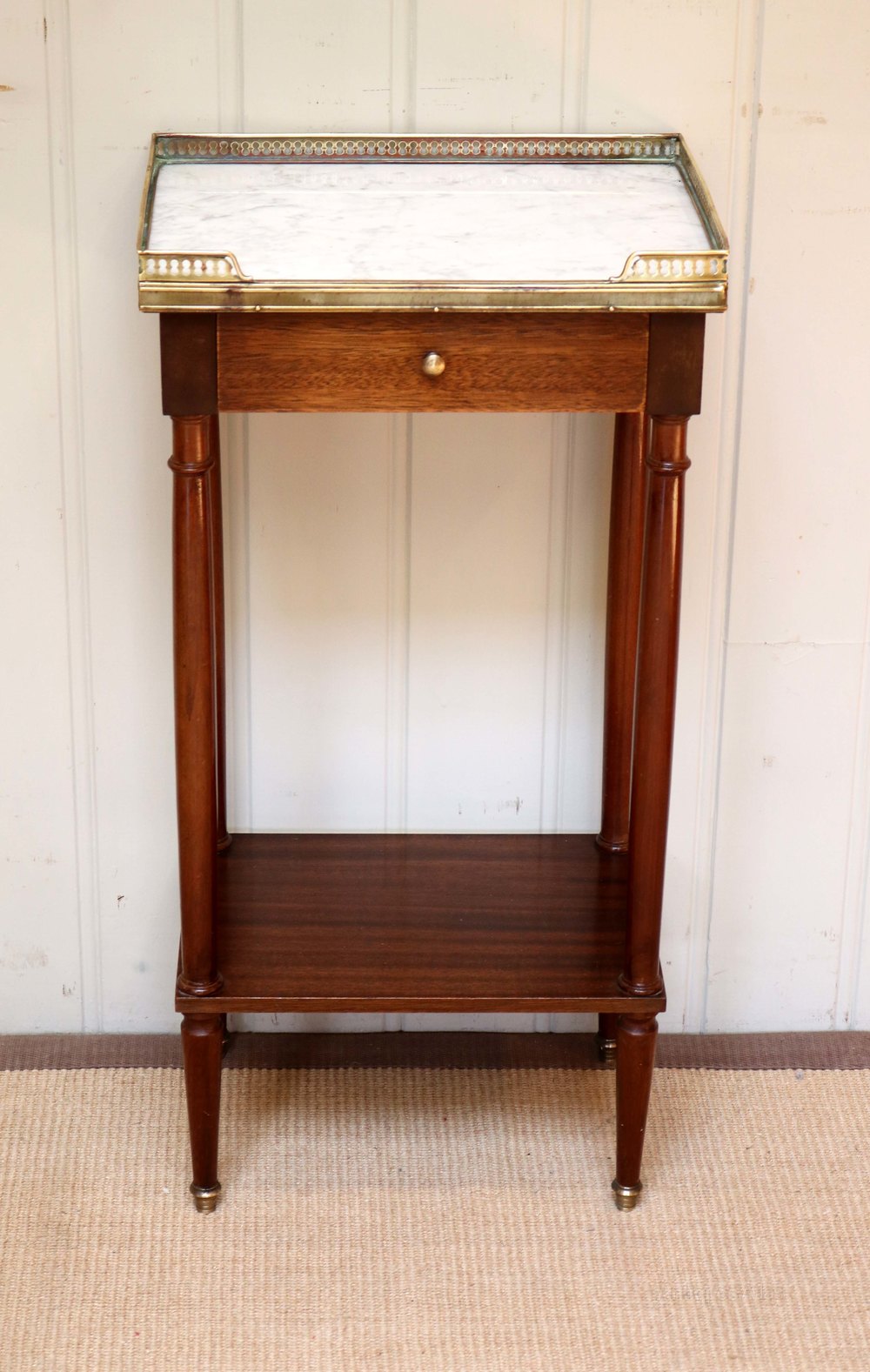 French mahogany cabinet having a single drawer above an open cupboard base with an undertier supported be turned tapering legs.Having a white marble top with a brass galleried edge