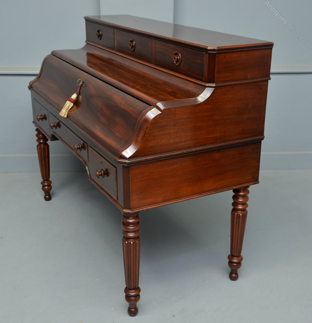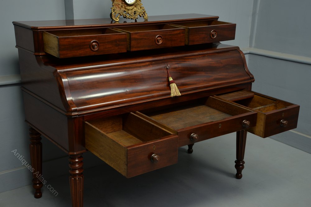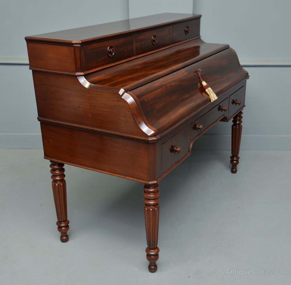 An exquisite French mahogany piano-front, roll-top desk of superior quality.