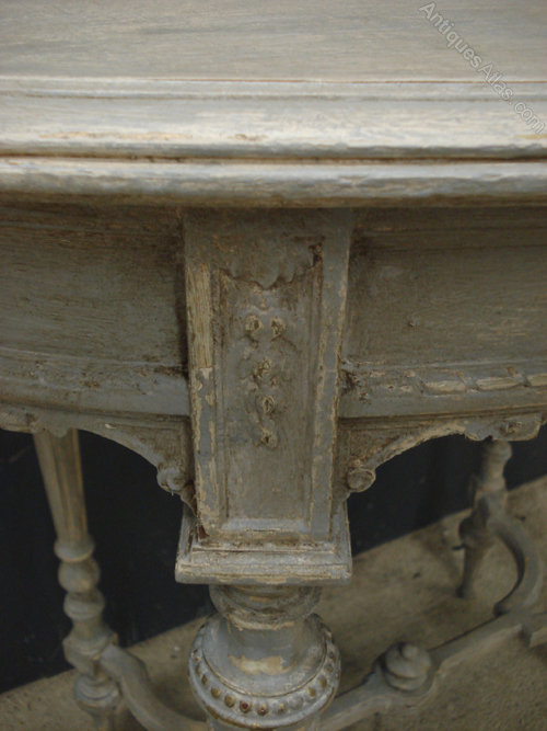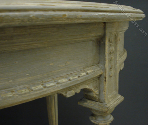Ref 3857 - Old French oval side table finished in worn pale grey over white/cream paint. Circa 1900.