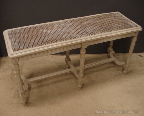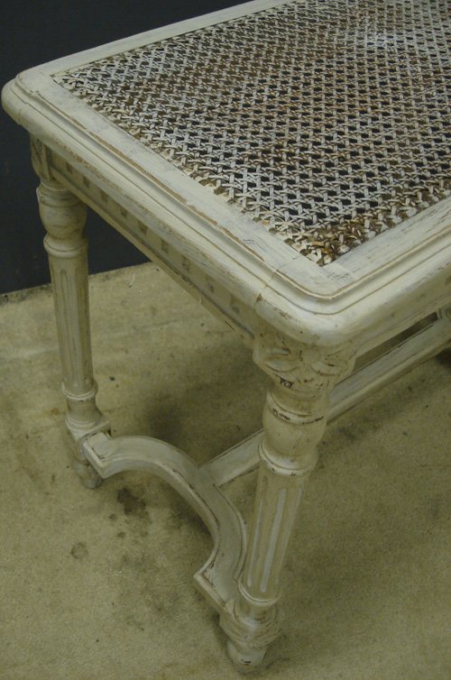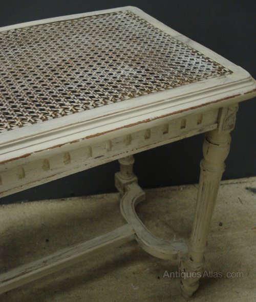 Ref 5341 - Old French worn pale grey painted cane stool. Circa 1900.