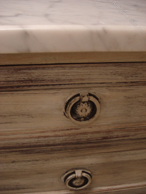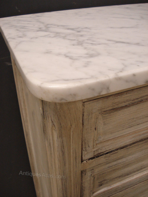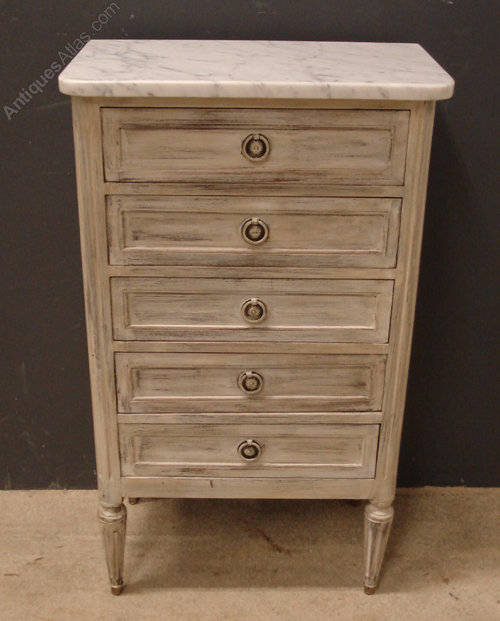Ref 4173 - Louis XVI style worn white painted five drawer chest with original white/grey figured marble top. Circa 1950.