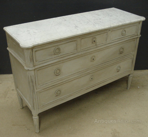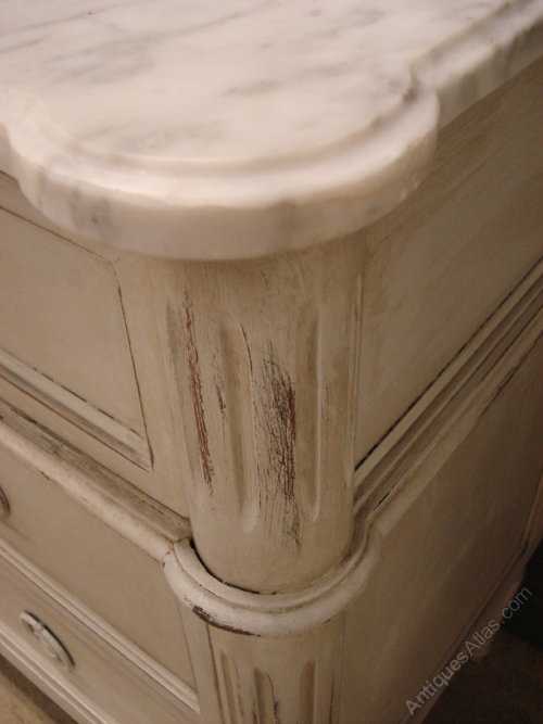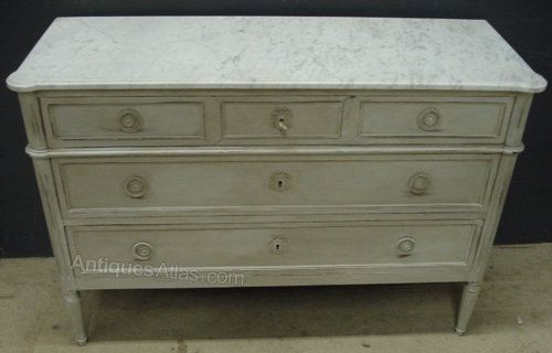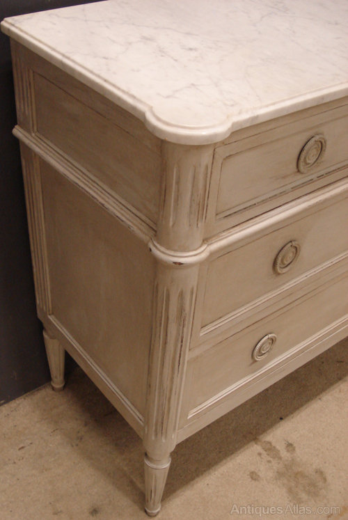Ref 4653 - Louis XVI style worn pale grey painted 3 drawer commode. Original white/grey figured shaped marble top. Working locks. Circa 1950.