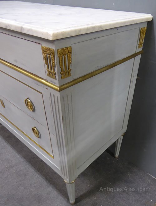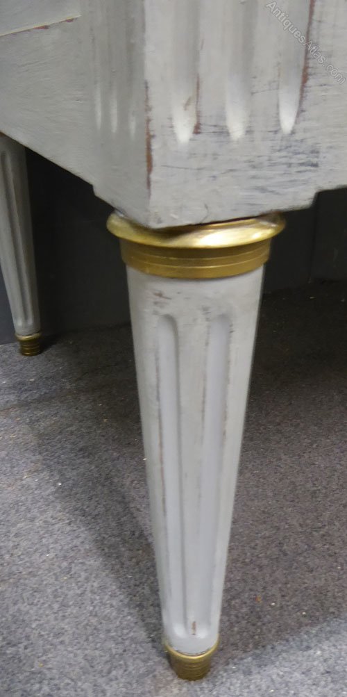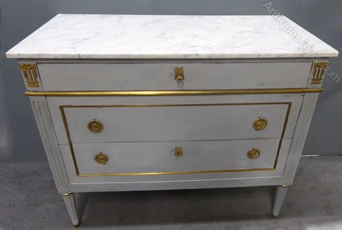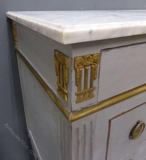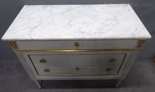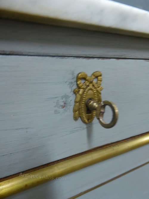 Ref 7366 - French Louis XVI style worn grey painted three drawer commode chest of drawers with original brass decoration. Original marble top. Working locks with key. Circa 1900.