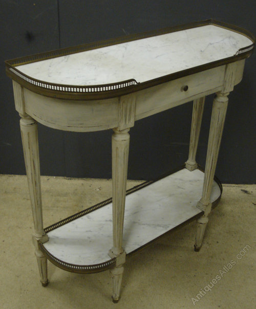 Ref 5071 - Worn pale grey painted console table with original grey/white figured marble top and shelf. Fretted brasswork to top and base. Single drawer. Circa 1950.