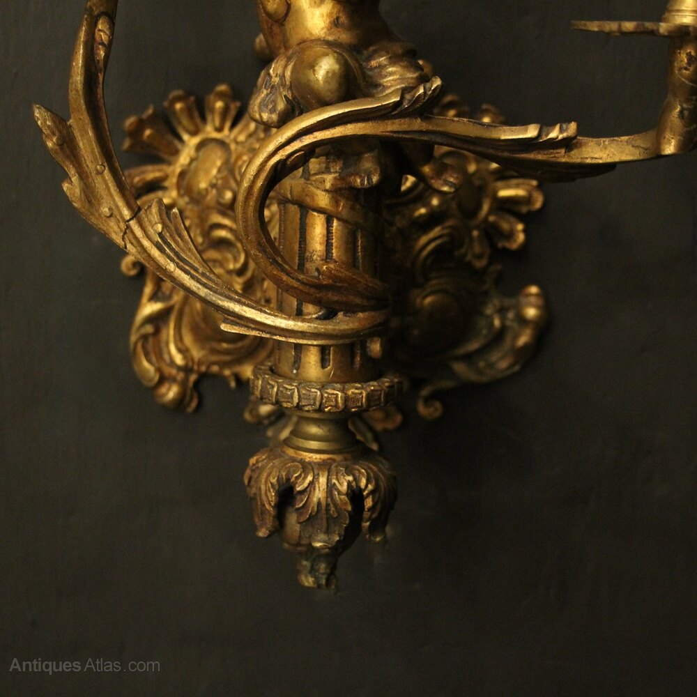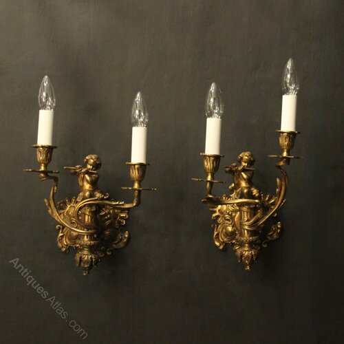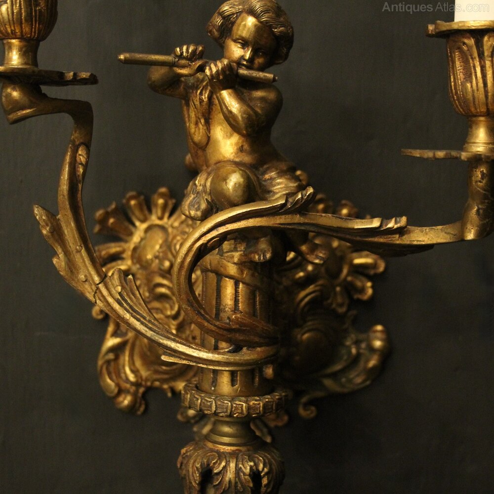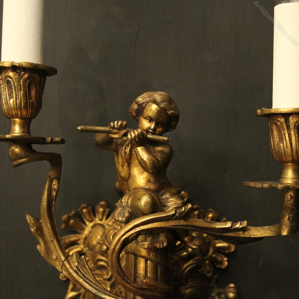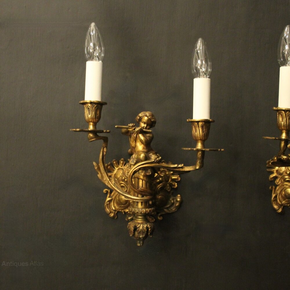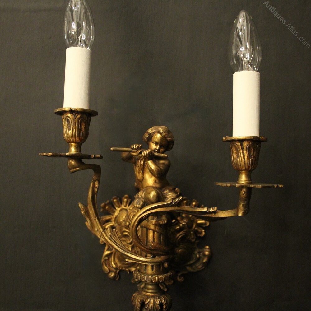 A quality pair of French gilded bronze twin arm antique wall sconces, the leaf scrolling arms with sectional leaf bobeche drip pans and bulbous reeded candle sconces, issuing from a decoratively cast cherub centre with ornate leaf backplate, sympathetically converted to electricity, lovely original patination and well cast. Fully rewired and PAT tested. All our wall lights come with aged brass screws or brackets for fixing and spare bulbs. There is an old repair to one arm.