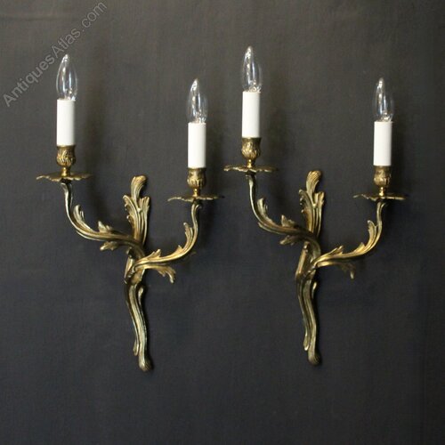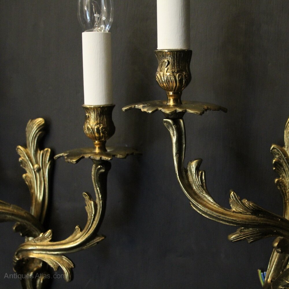 A French pair of gilded brass twin arm wall lights, the tiered leaf clad scrolling arms with foliated bobeche drip pans and bulbous candle sconces, issuing from a scrolling leaf backplate. Fully rewired and PAT tested. All our wall lights come with aged brass screws or brackets for fixing and spare bulbs.