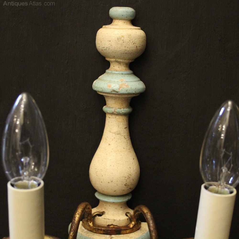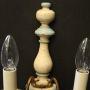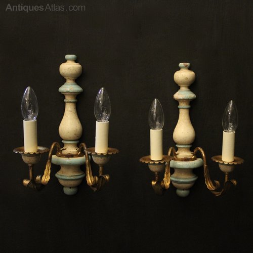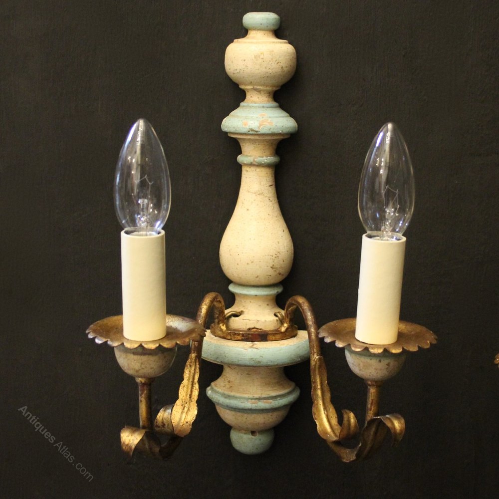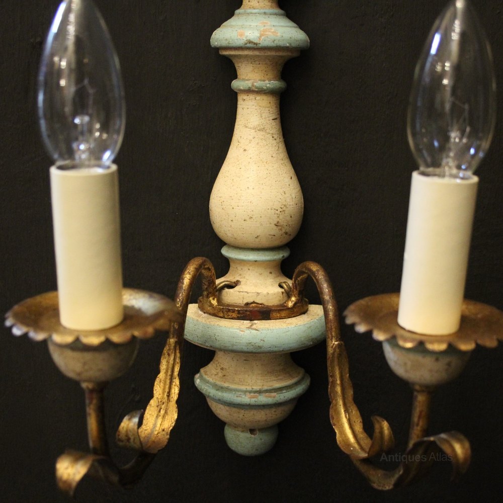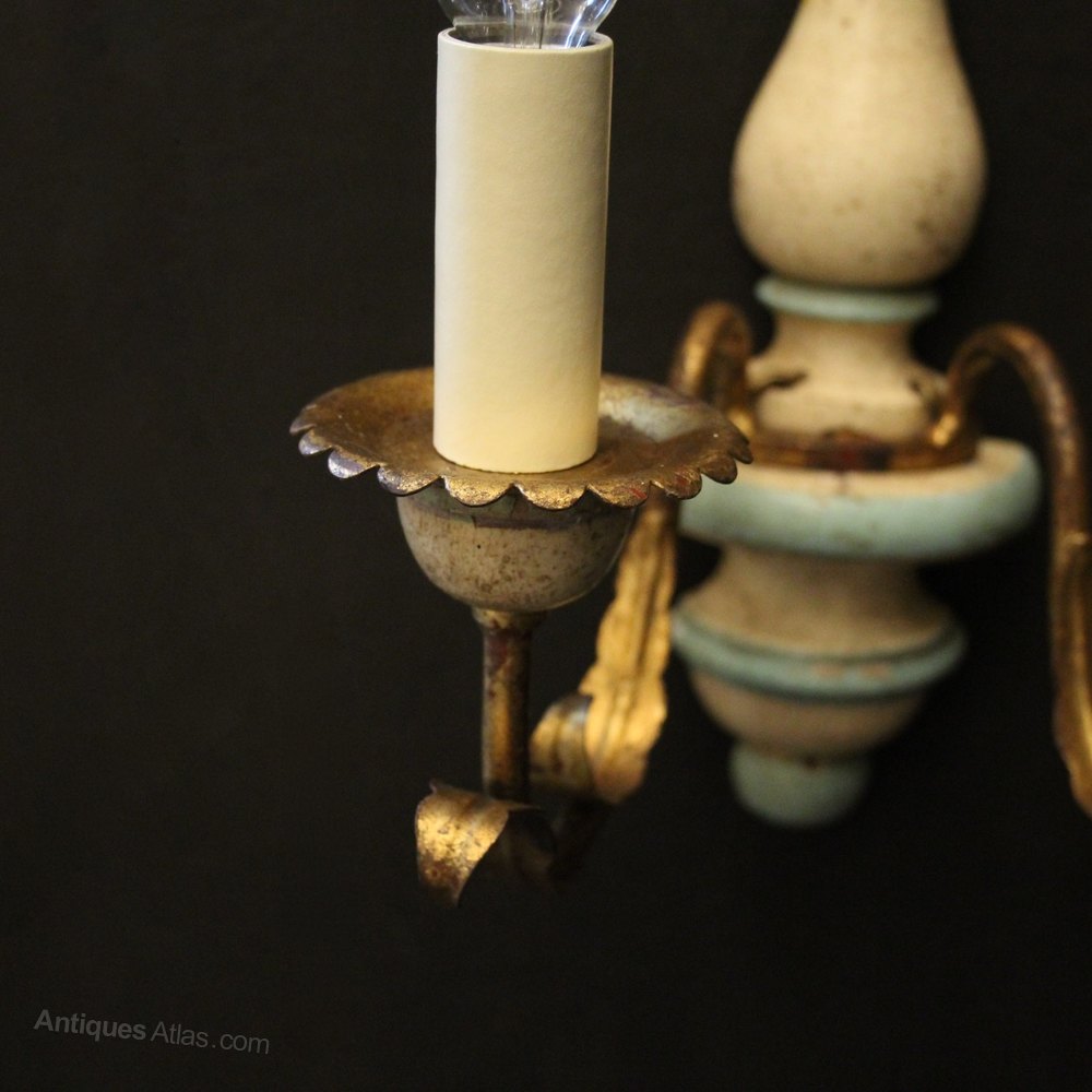 A pretty pair of French polychrome and toleware twin arm wall lights, the gilded metal leaf scrolling arms with wooden bobeche drip pans, issuing from a knopped polychrome wooden backplate, lovely original patination and good form. Fully rewired and PAT tested. All our wall lights come with aged brass screws for fixing and spare bulbs.