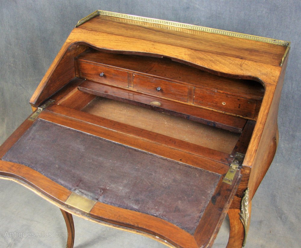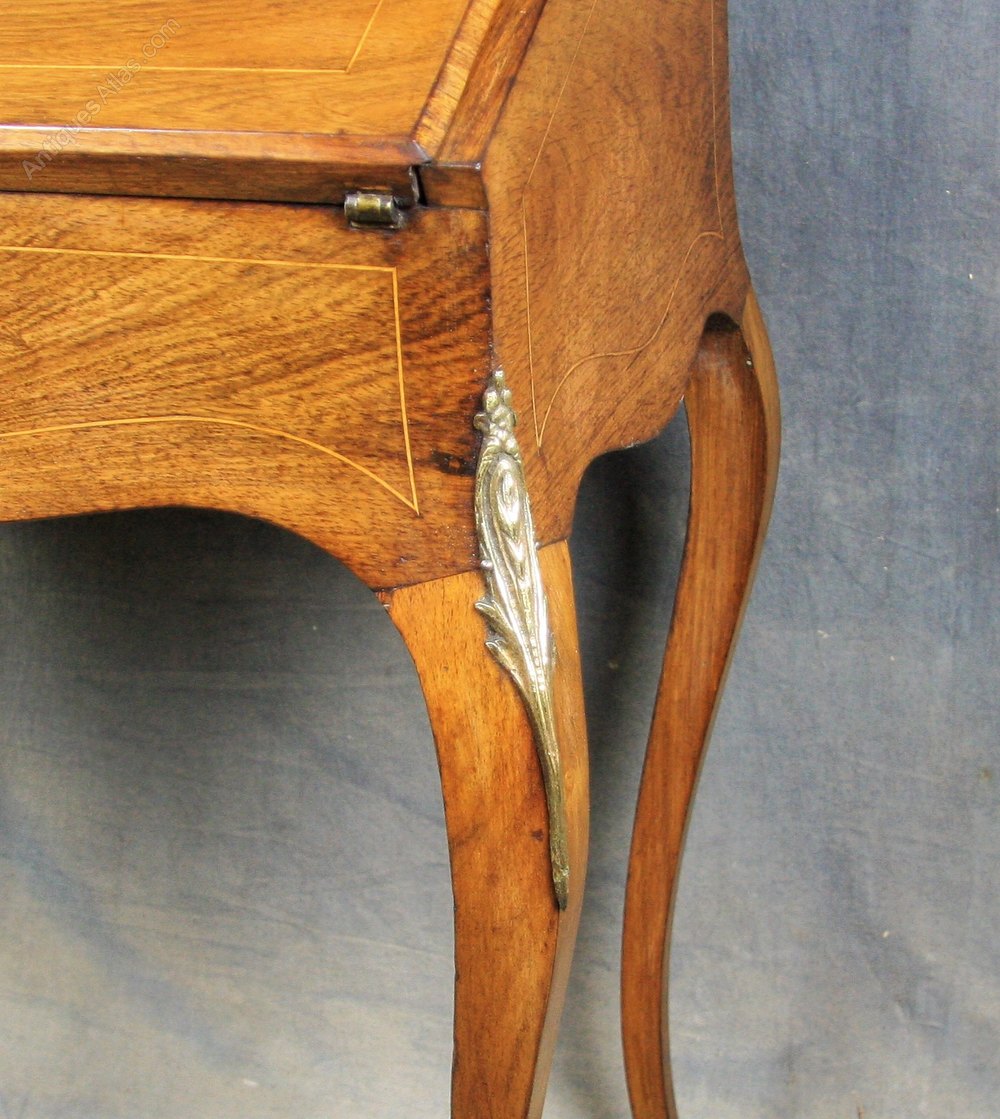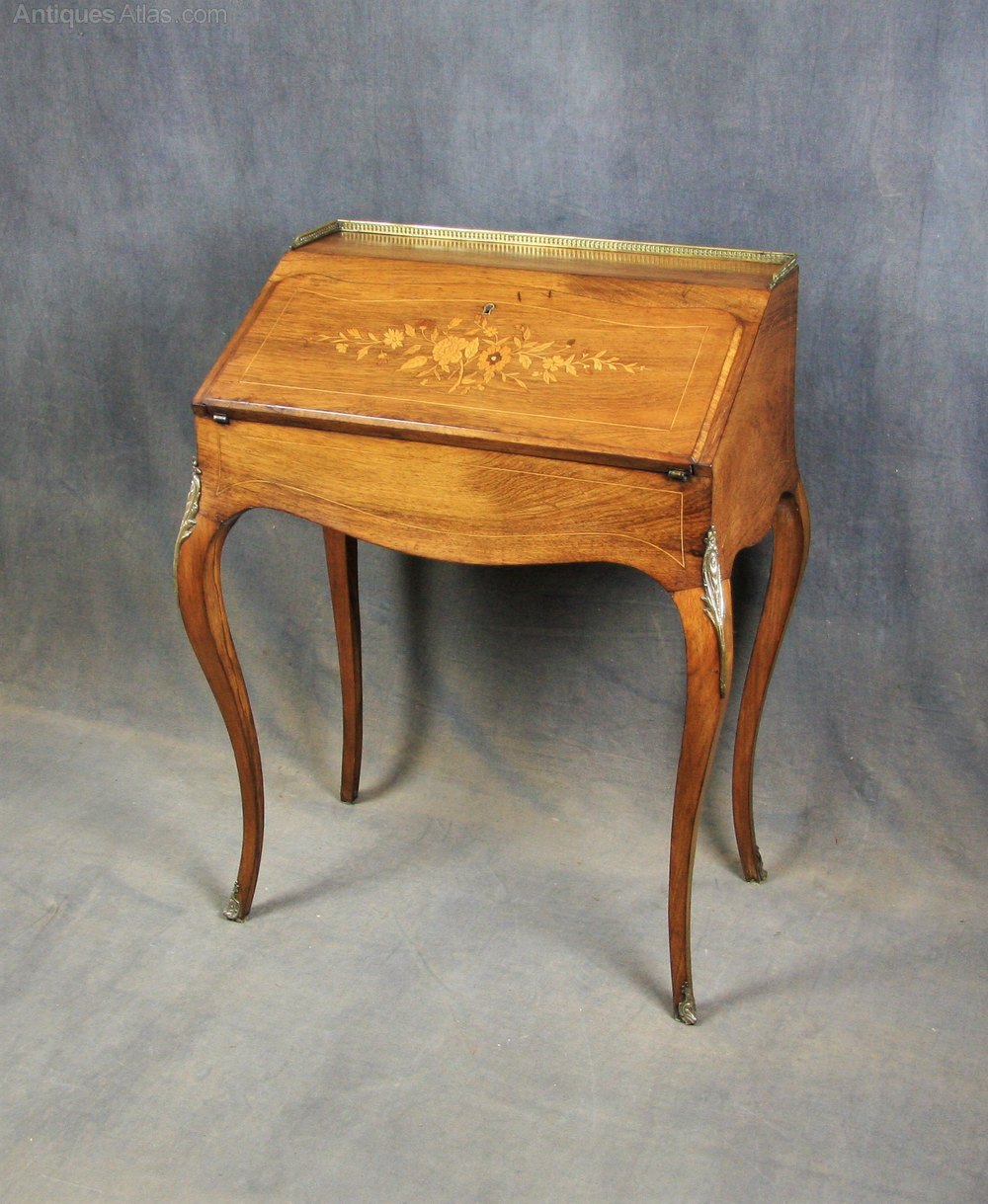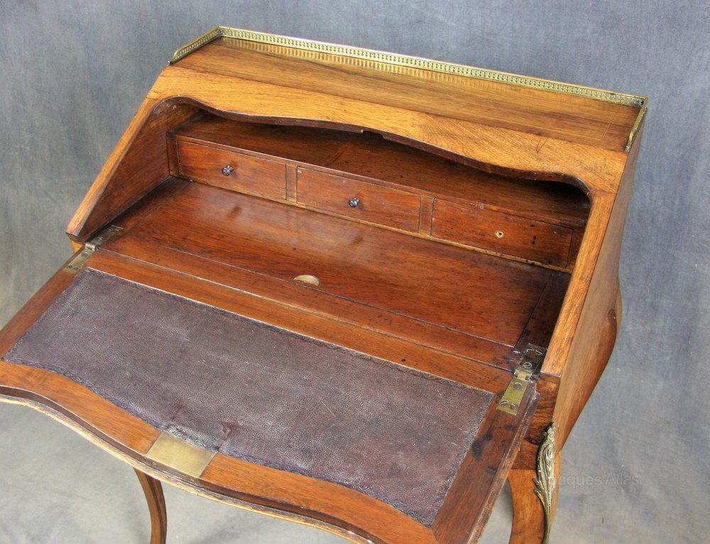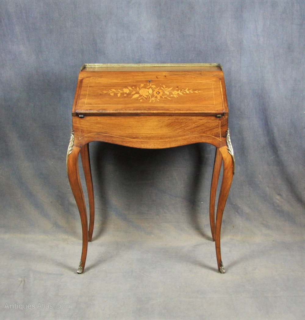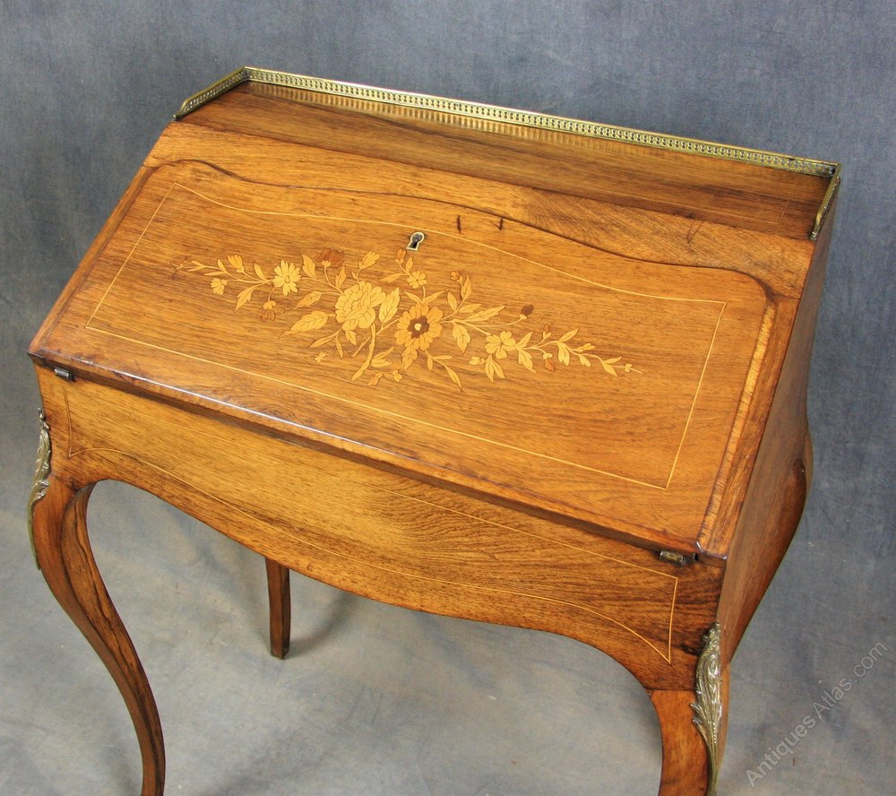 Lovely quality 19th century French rosewood and marquetry Louis XV style bureau de dame having gilt bronze gallery over floral marquetry inlaid fall front that opens to reveal leather writing surface and sunken well with pigeon holes and drawers standing cabriole legs with ormolu mounts.
