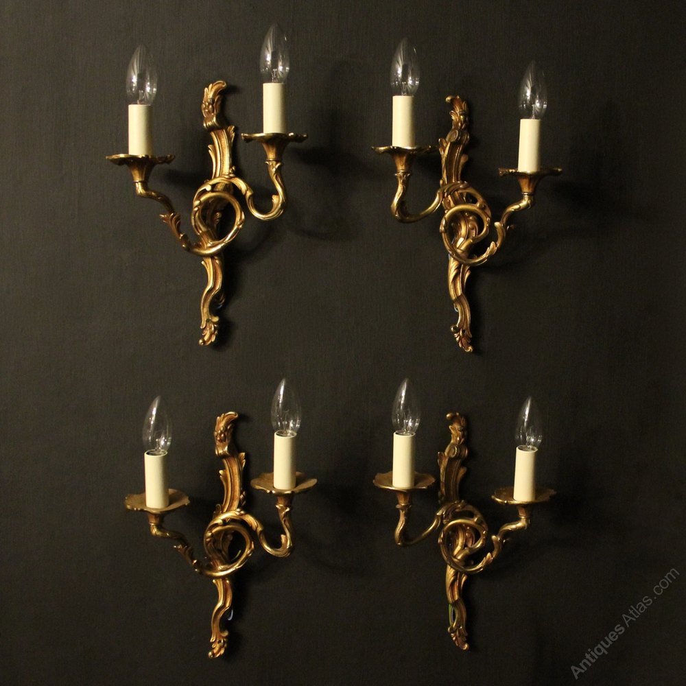 A French set of 4 gilded brass twin arm opposing antique wall lights, the stepped leaf clad scrolling arms with trumpet leaf bobeche drip pans, issuing from an opposing leaf backplate, nice original crisp gilded patination. Fully rewired and PAT tested. All our wall lights come with aged brass screws for fixing and spare bulbs.