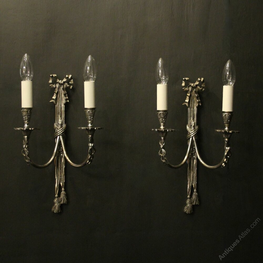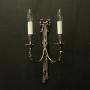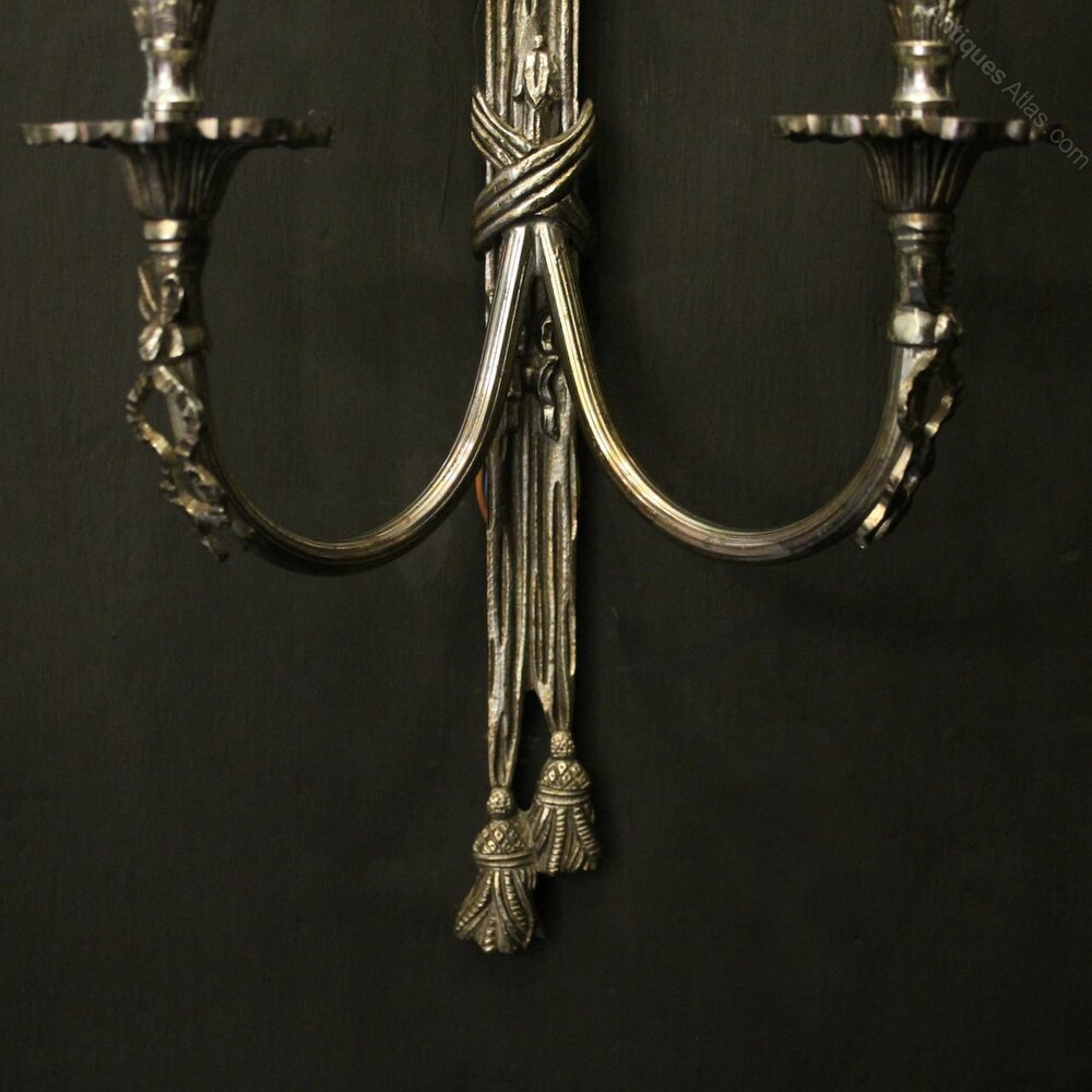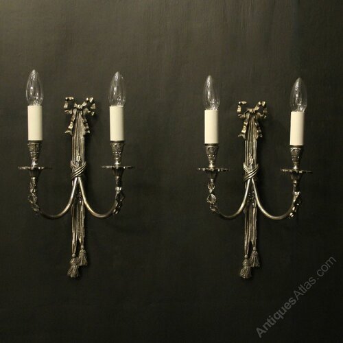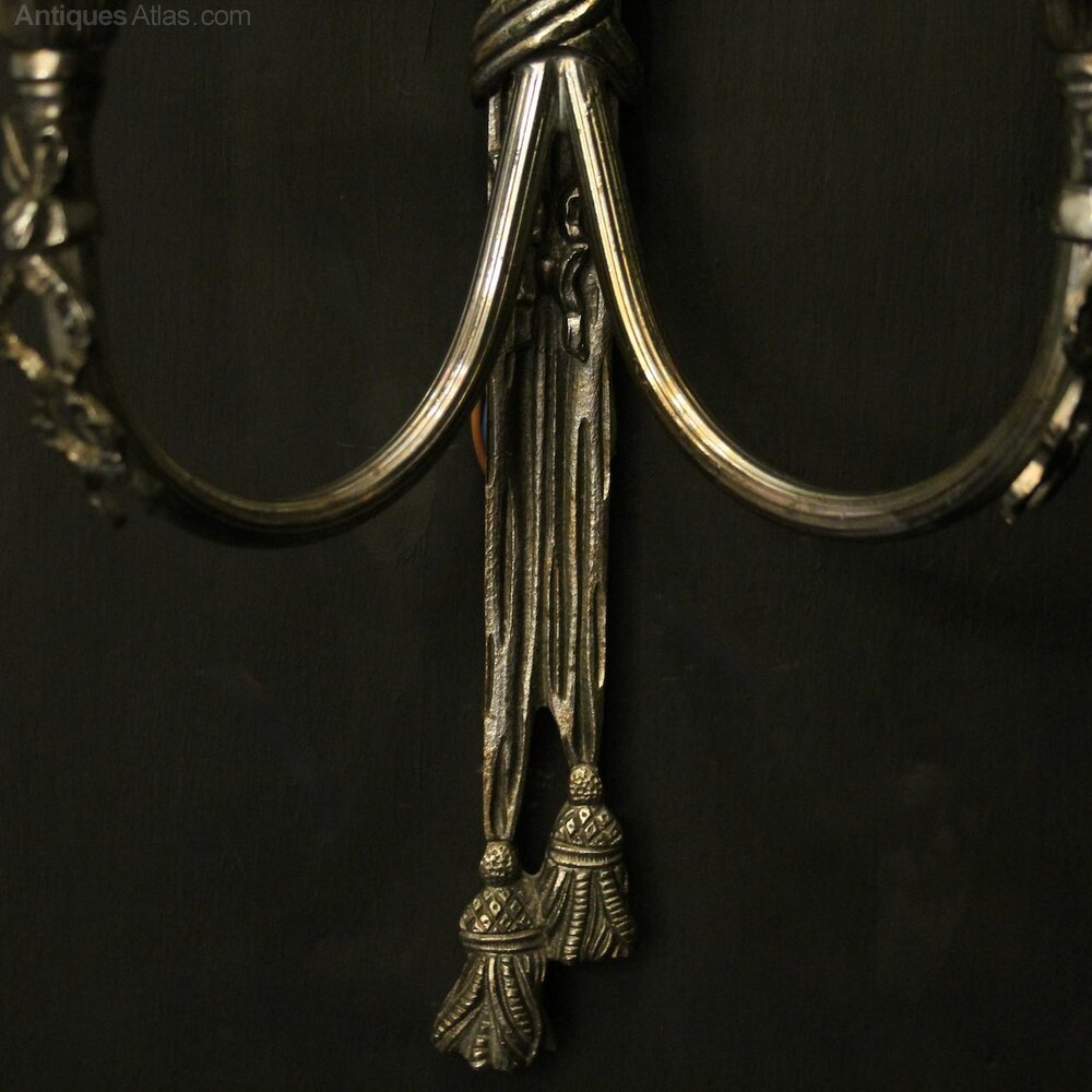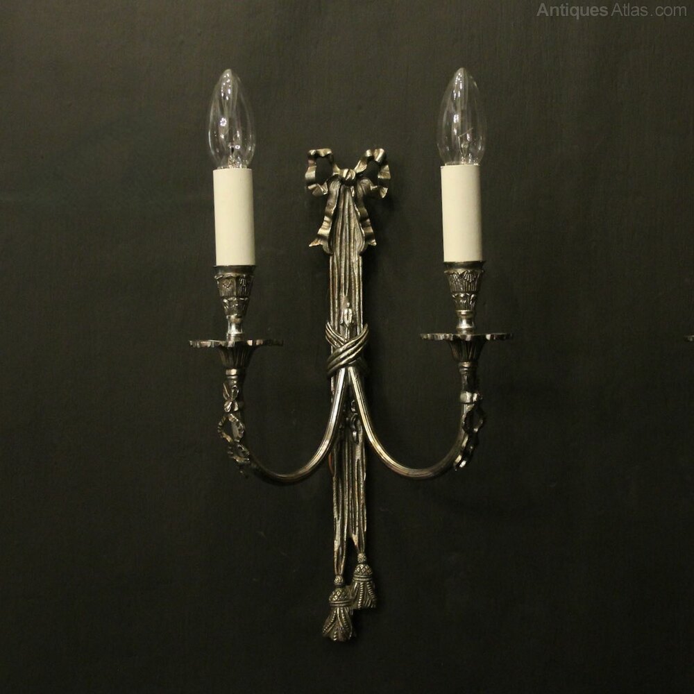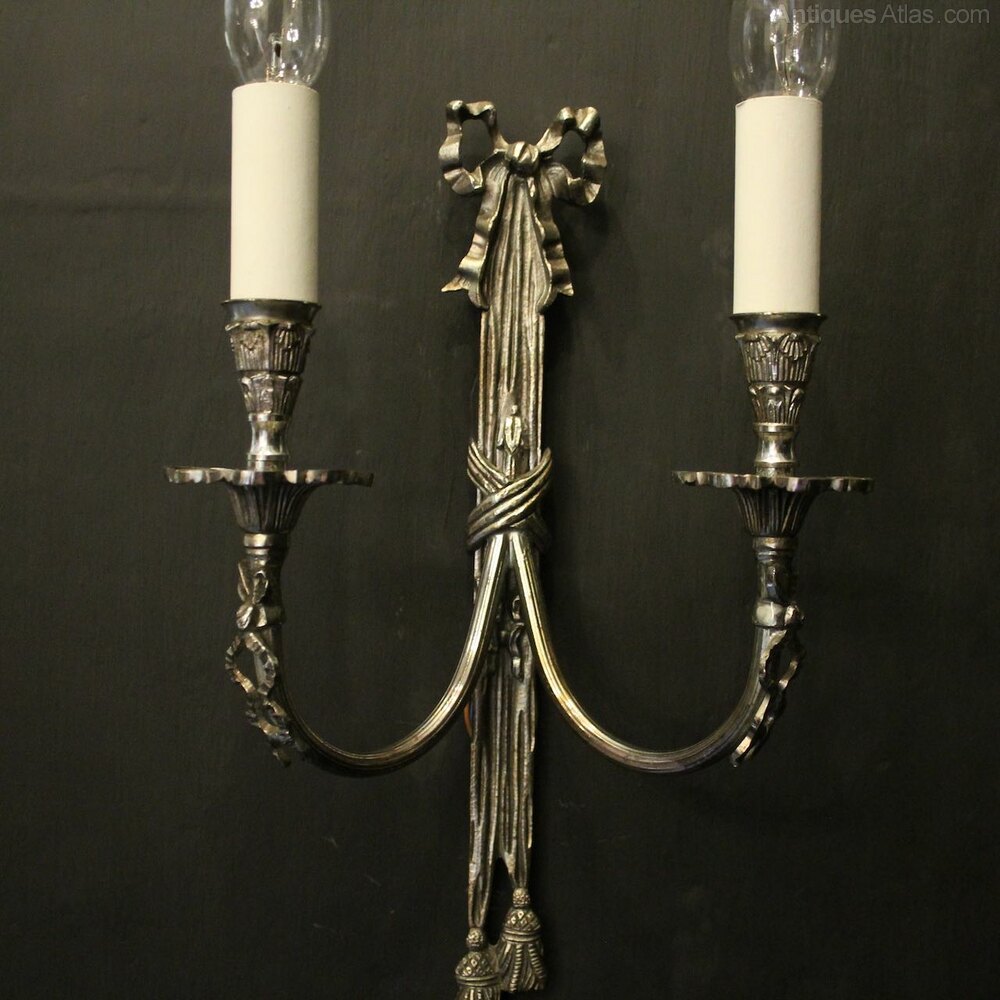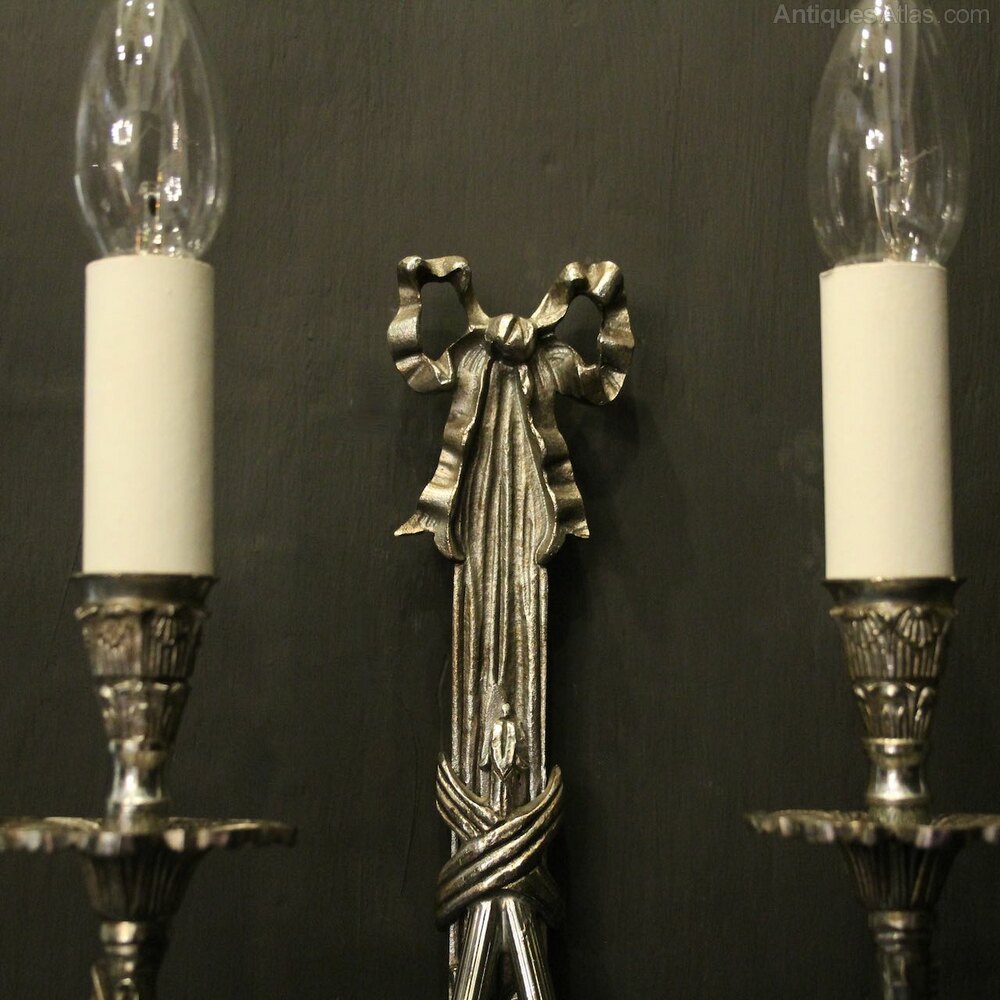 A French pair of ribbon and tassel silver gilded brass twin arm wall lights, the reeded scrolling arms with leaf bobeche drip pans and reeded candle sconces, issuing from a decorative backplate with pierced ribbon finial and tassel terminal, nice original patination. Fully rewired and PAT tested. All our wall lights come with aged brass screws for fixing and spare bulbs.