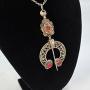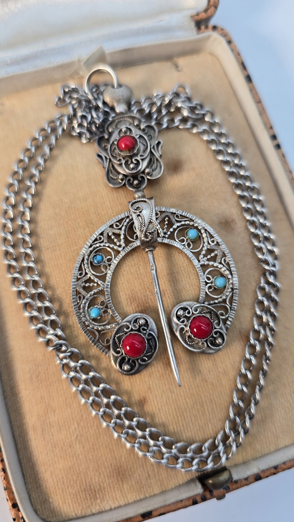 It is a beautiful handmade piece of jewellery with an intricate construction of filigree type wire work with hand tooled decoration, brightly set with cabochons of red coral and turquoise.