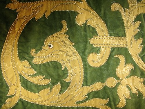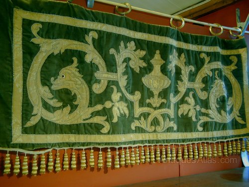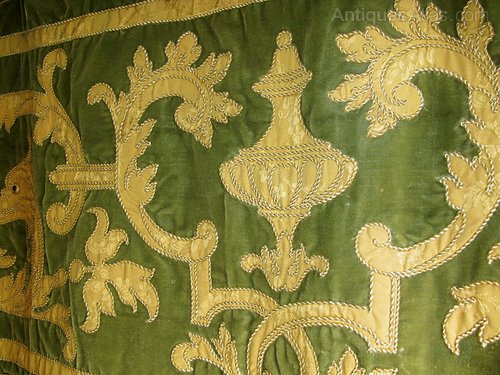 A good french tapestry pelmet - bed hanging with gilded and silk treads depicting the Dauphin on a green velvet ground.