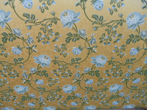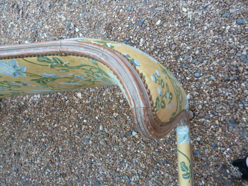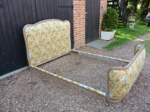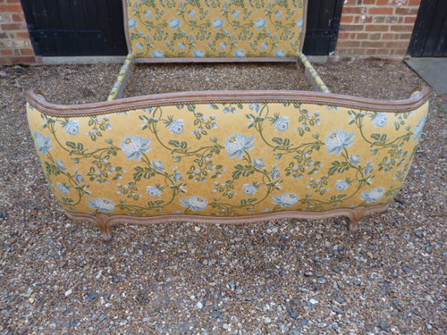 Elegant French Corbiere double bed. The beach frame has been fully recovered in heavy linen print in yellow,blue and greens, the side rails have also been recovered.It is edged with brass studs.