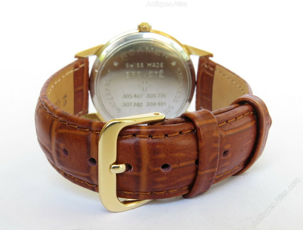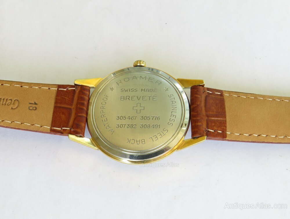The signed dial is in beautiful original condition with original hands, centre seconds hand and outer minute markers. The outer chapter ring is stamped ‘pm’, this stands for promethium which Roamer used instead of radium as a luminous material.