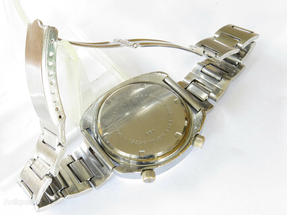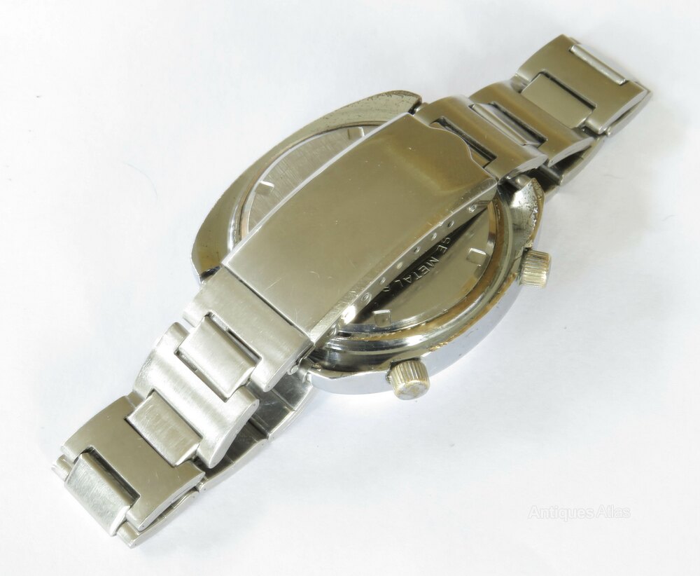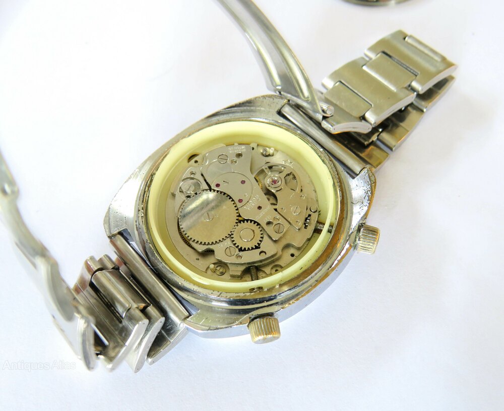 The watch measures 39mm wide excluding the crowns and 36mm high excluding the lugs. The case is chromium plated while the screw-on case back is stainless steel. There is a little rubbing to the front, more to the back of the watch, and general surface marking, and some wear to the finish on the ends of the crowns.