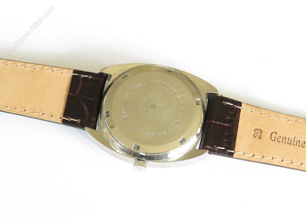 The signed dial is in its original finish with original hands and red centre seconds hand. There is a date display which is an early form of quickset… the hands are repeatedly moved backwards and forwards between 12 midnight and 9pm until the desired date is reached.