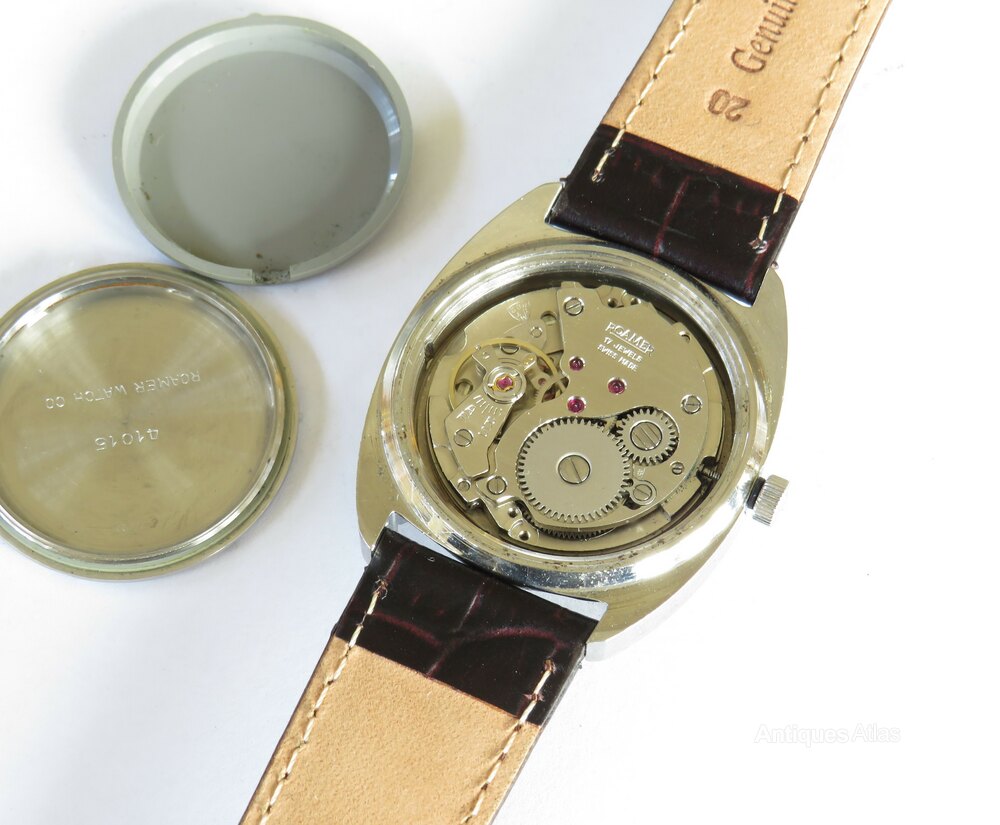 The watch measures 34mm wide excluding the winding crown and 34mm high excluding the lugs. The case is stainless steel and it is in good condition with just minor marking. The case back and winding crown are signed with the Roamer ‘r’ logo.