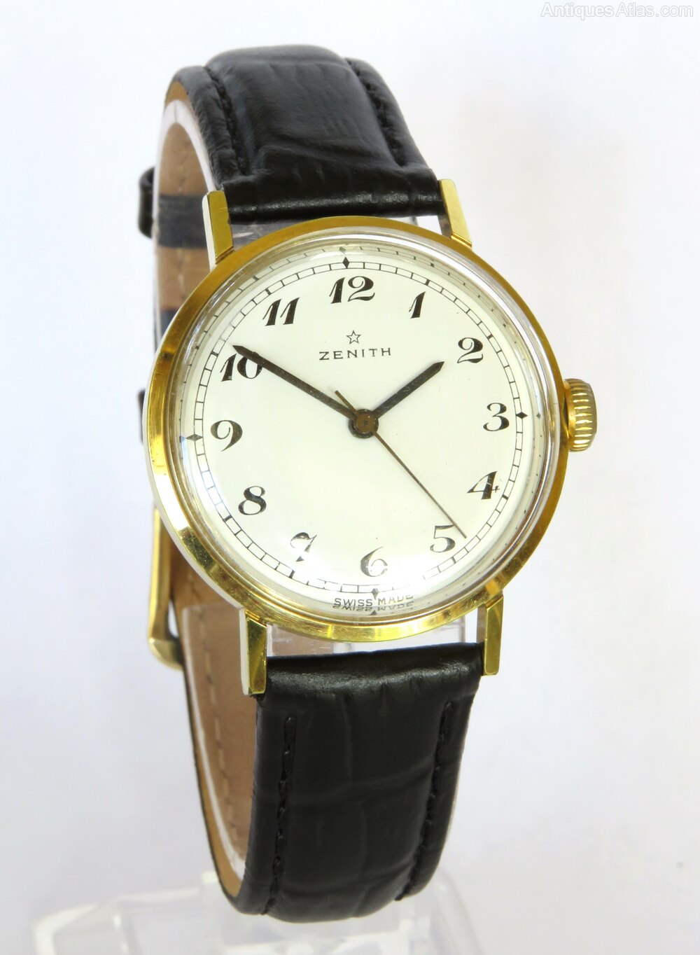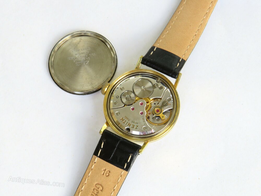 The watch measures 31mm diameter excluding the winding crown and the lugs. The case is gold filled. The front of the case is in good condition, some plate loss to the side of the watch. Stainless steel screw-on case back, signed inside with the Zenith name.