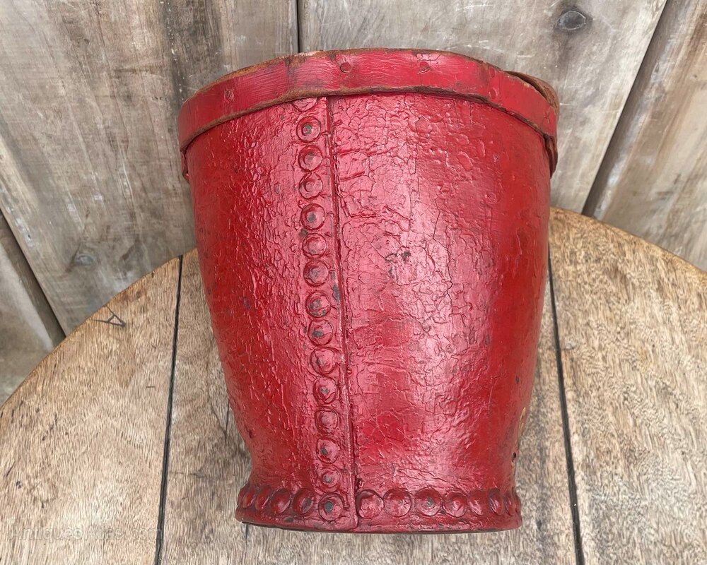 A late 18th century red painted armorial leather fire bucket, painted with the phrase: