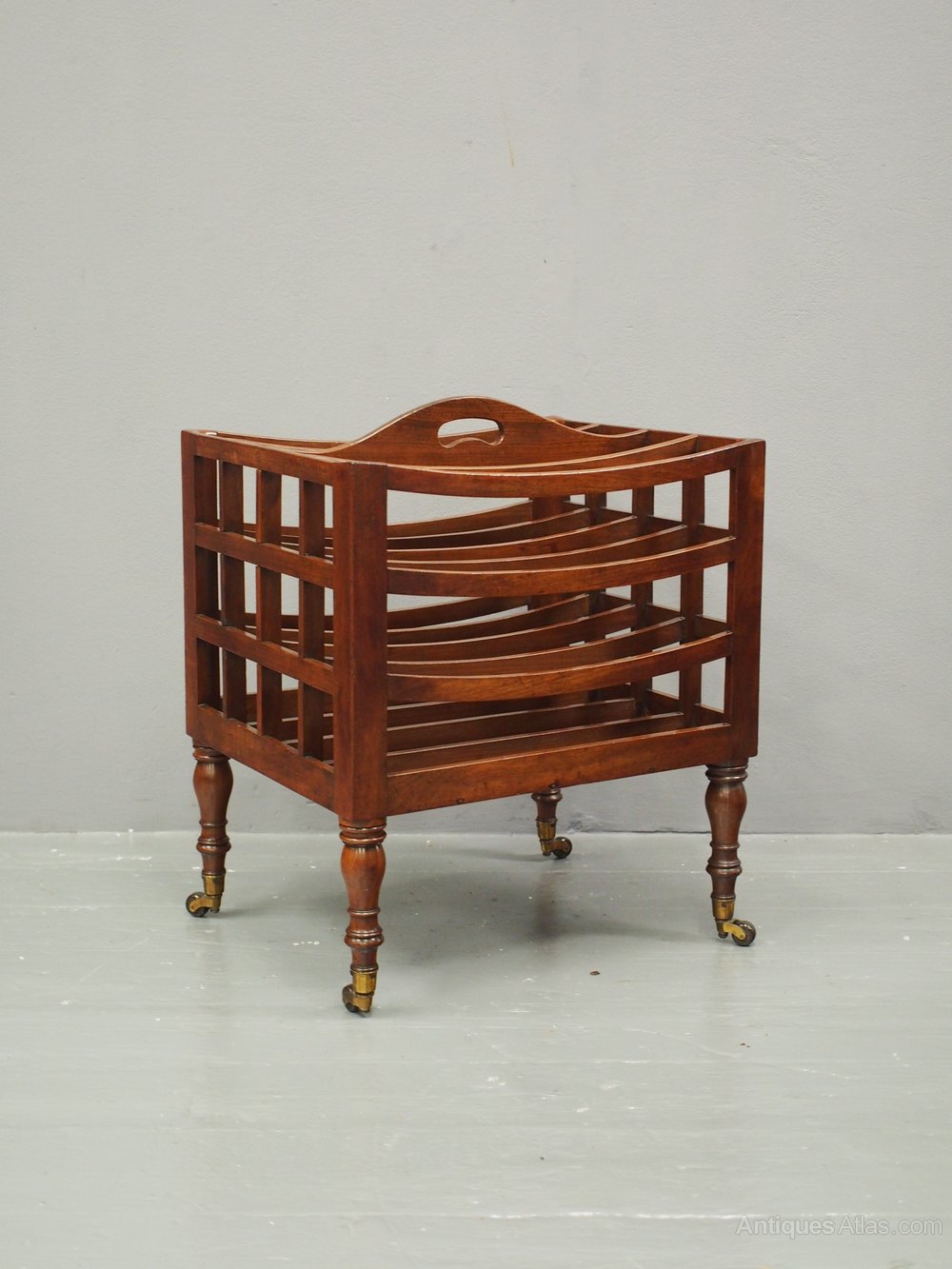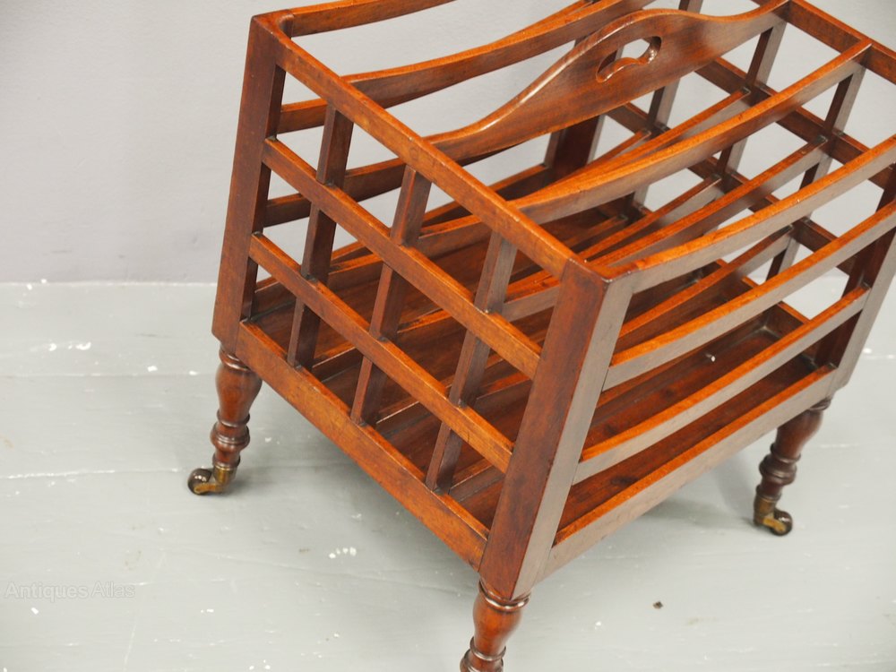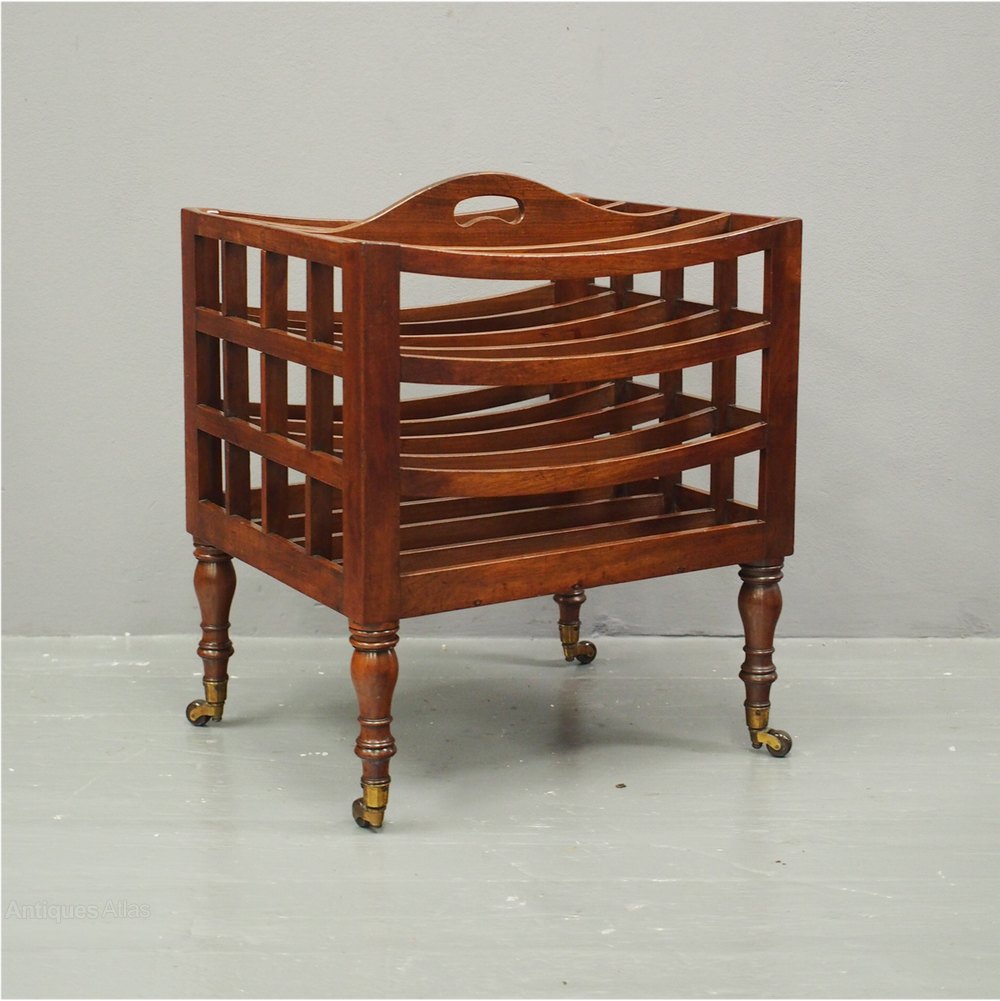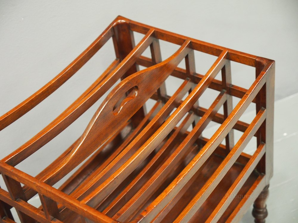Circa 1800, late George III mahogany canterbury of generous proportions. With curved top section, a central lifting handle to one of the 4 divisions, all with 3 shaped splats. Inside the square, main uprights, is chamfering and a carved pattern, with further narrow uprights to the sides. A polished mahogany base above a wrap-around rail (preventing paper or magazines from slipping out) and standing on turned, ring turned and tapering legs finishing on a brass cup and brass brown porcelain castors.