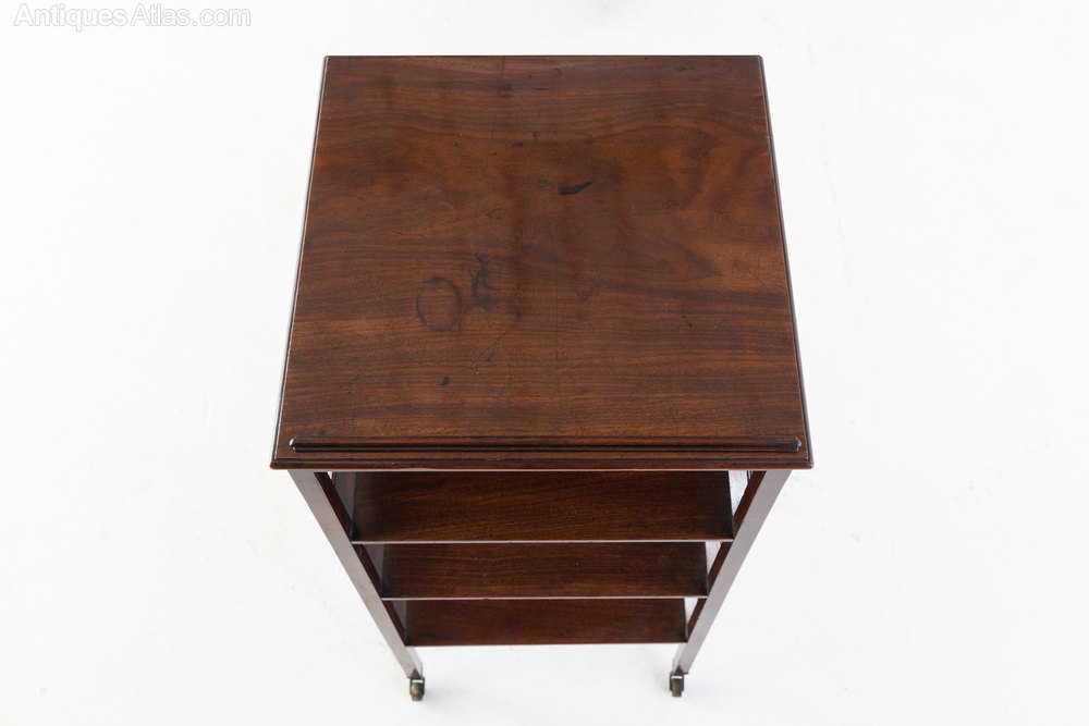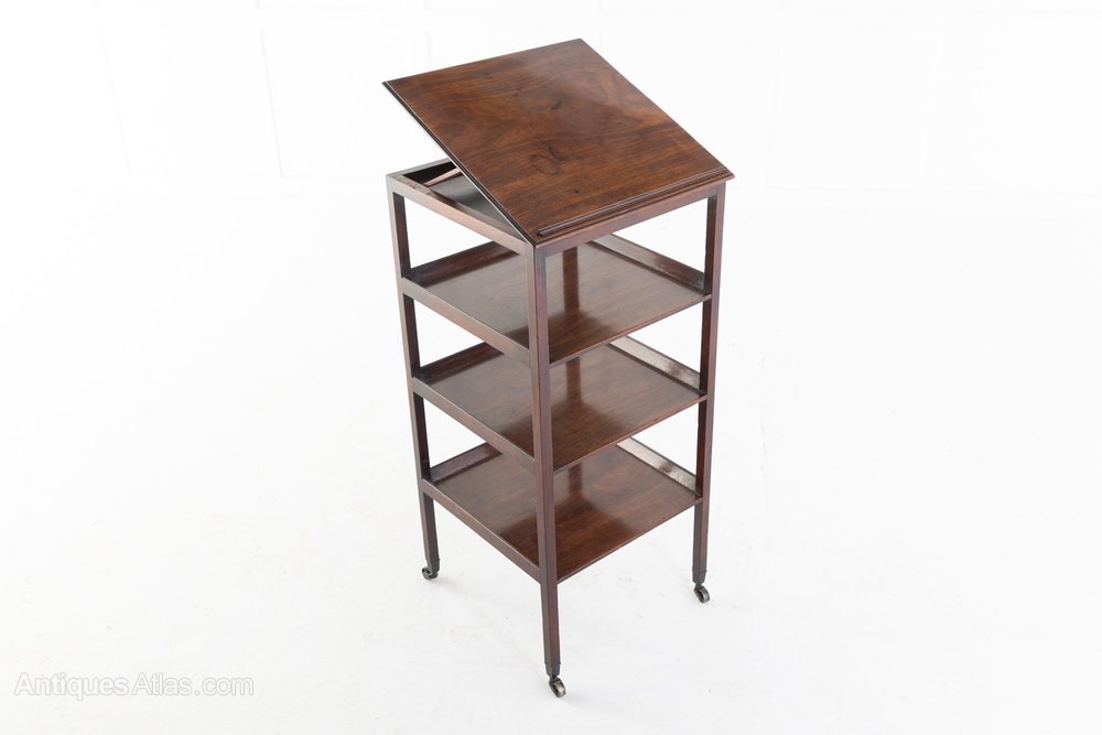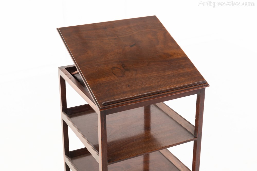 18th Century George III mahogany, four tier what-not with adjustable reading slope. Of very simple design and quality with good use of timbers and having its original casters.