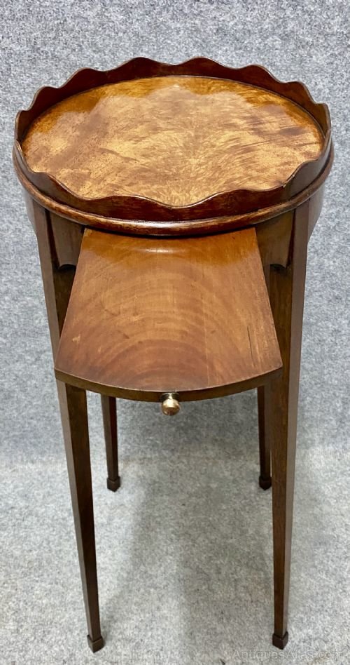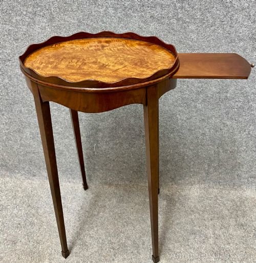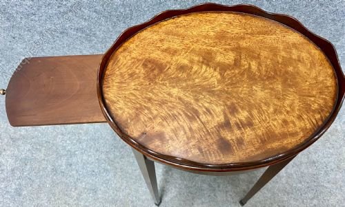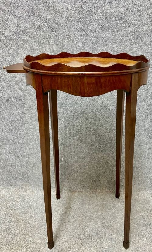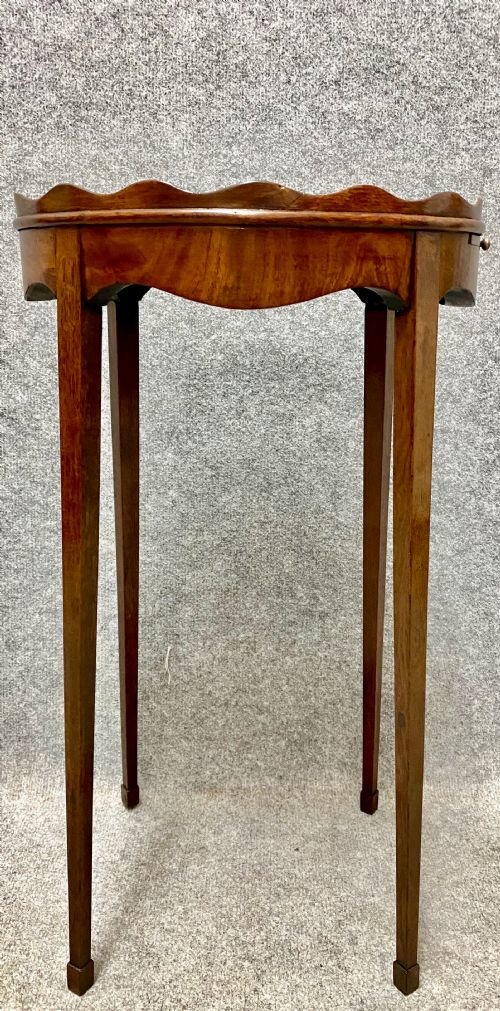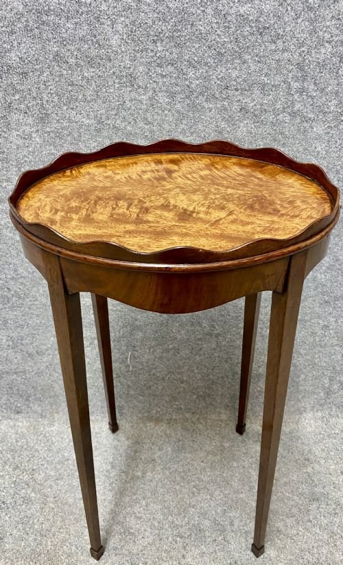 An attractive and unusual George III figured mahogany oval urn stand circa 1780. The raised scalloped gallery above the beautifully figured top with side slide and shaped frieze, the whole raised on square tapering legs with square block feet. Condition - very good with no breaks. Dimensions:- Height…25''/ 63.5cm. Width…14.25''/ 36.5cm. Depth…10.25''/ 26cm. Carrier delivery to most of U.K. mainland £45.