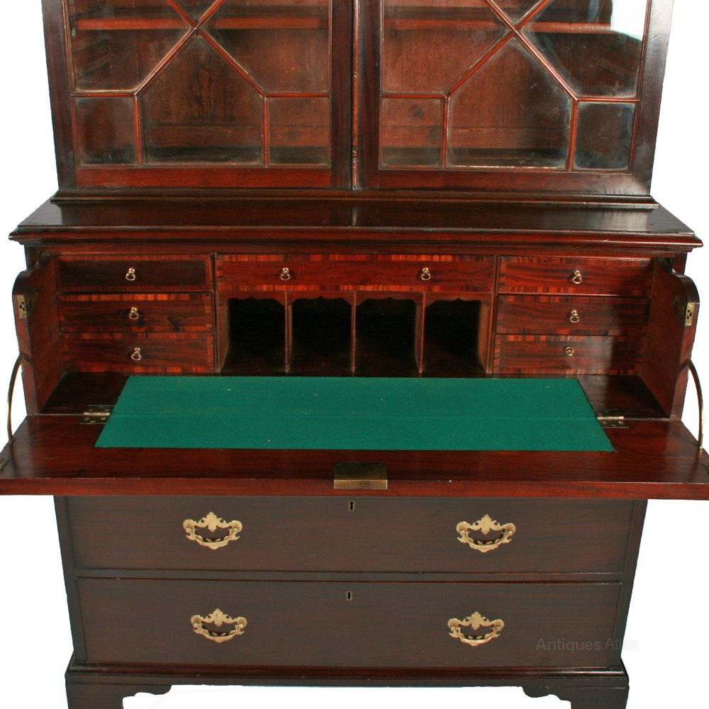 The secretaire chest has a fitted top drawer with a fall front writing surface, inside there are seven mahogany drawers with rosewood cross banding and four pigeon holes. The chest has three more oak lined drawers with replacement period style brass handles. The bookcase top has a pair of glazed panel doors and three adjustable shelves that slide into position. The top has a dental cornice with a cross banded frieze. The bookcase has had the polish sympathetically restored.