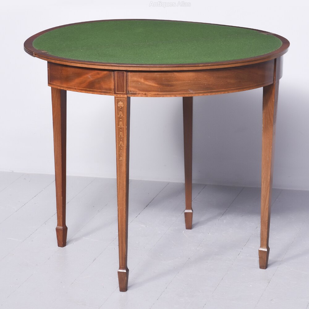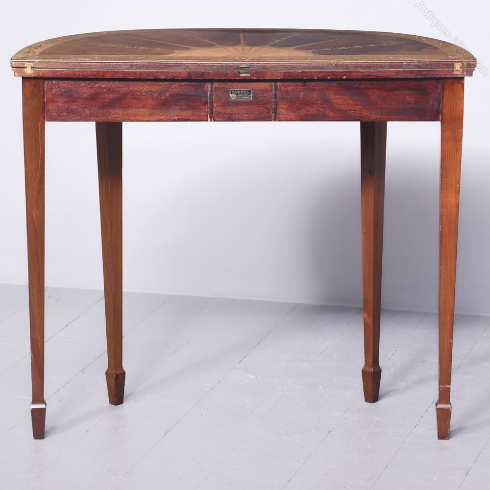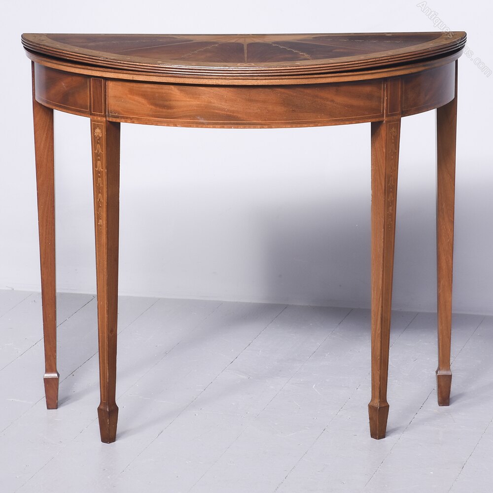 Circa 1900. An interesting George III style mahogany and inlaid demi-lune fold over card table. The top which is profusely inlaid with swags, ribbons, shell, harebells in various wood, including boxwood, satinwood, purpleheart and flame mahogany, the top is hinged and opens to reveal a felt lined interior with broad cross-banding, the fore-edges are ribbed with a simple frieze framed in boxwood inlay. The two back legs are hinged and swing out to support the top when open, all resting on four square tapering legs, with inlay on the facings framed by boxwood, finishing on an elegant splayed toes.