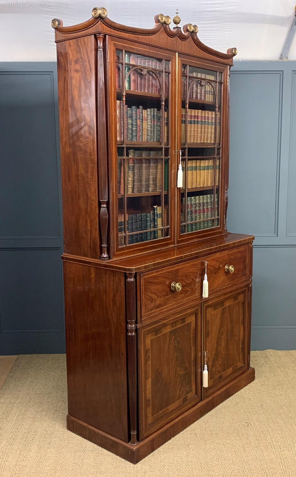A superb quality George IV period secretaire bookcase of generous proportions. Of fine construction in well chosen solid mahogany and attractive flame mahogany veneers. Decorated with inlaid satinwood stringing throughout and cross banded in rosewood. The corners flanked with bold and impressive turned and reeded columns. The top section with a pair of glazed doors which open to access a display space with adjustable shelving. All surmounted by an elaborate cornice complete with solid brass medallions and a central urn. The base section with a deep drawer containing a fully fitted secretaire. Below are a pair or cupboard doors which open to reveal cupboard storage space with a shelved interior. All doors are drawers are lockable with keys supplied. This wonderful bookcase is offered for sale in excellent original condition, with a splendid colour and patina, ready to go straight into the home. Splits into two sections for ease of installation.
