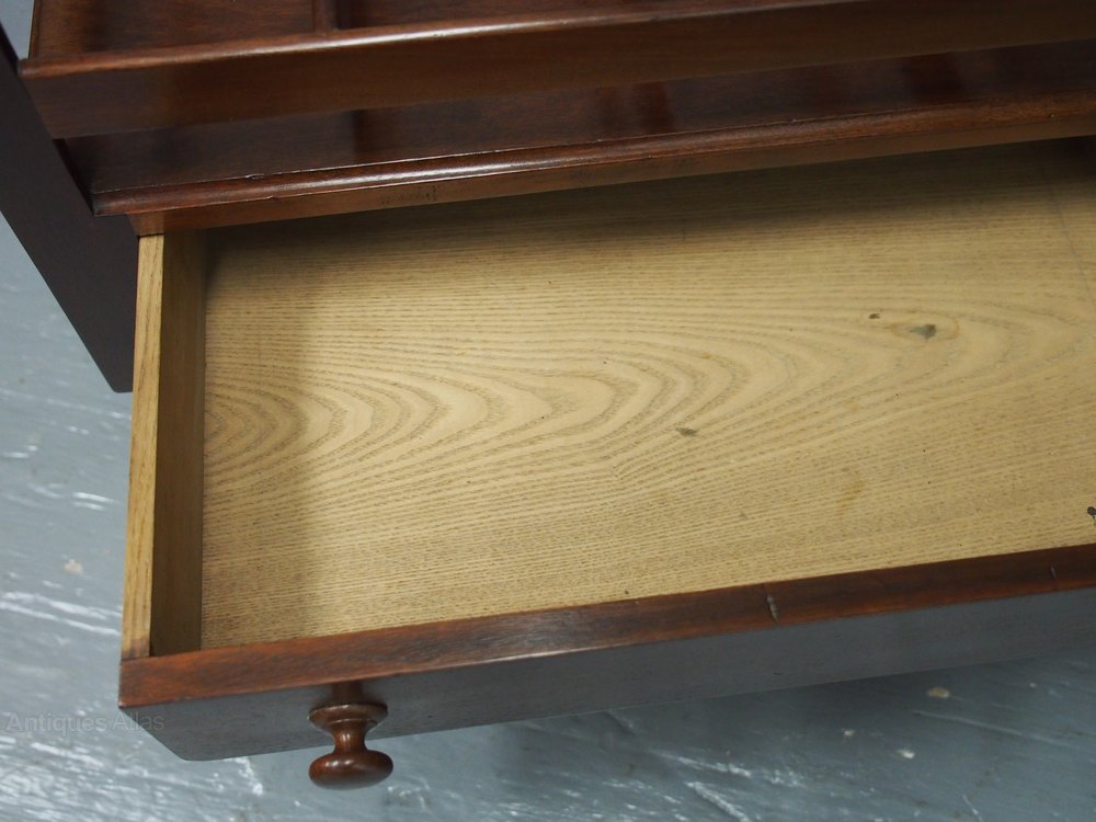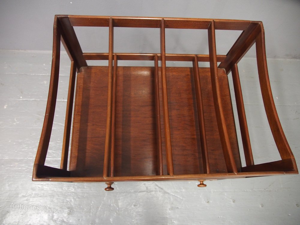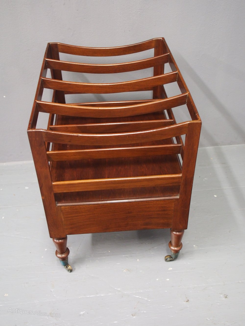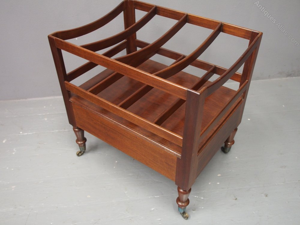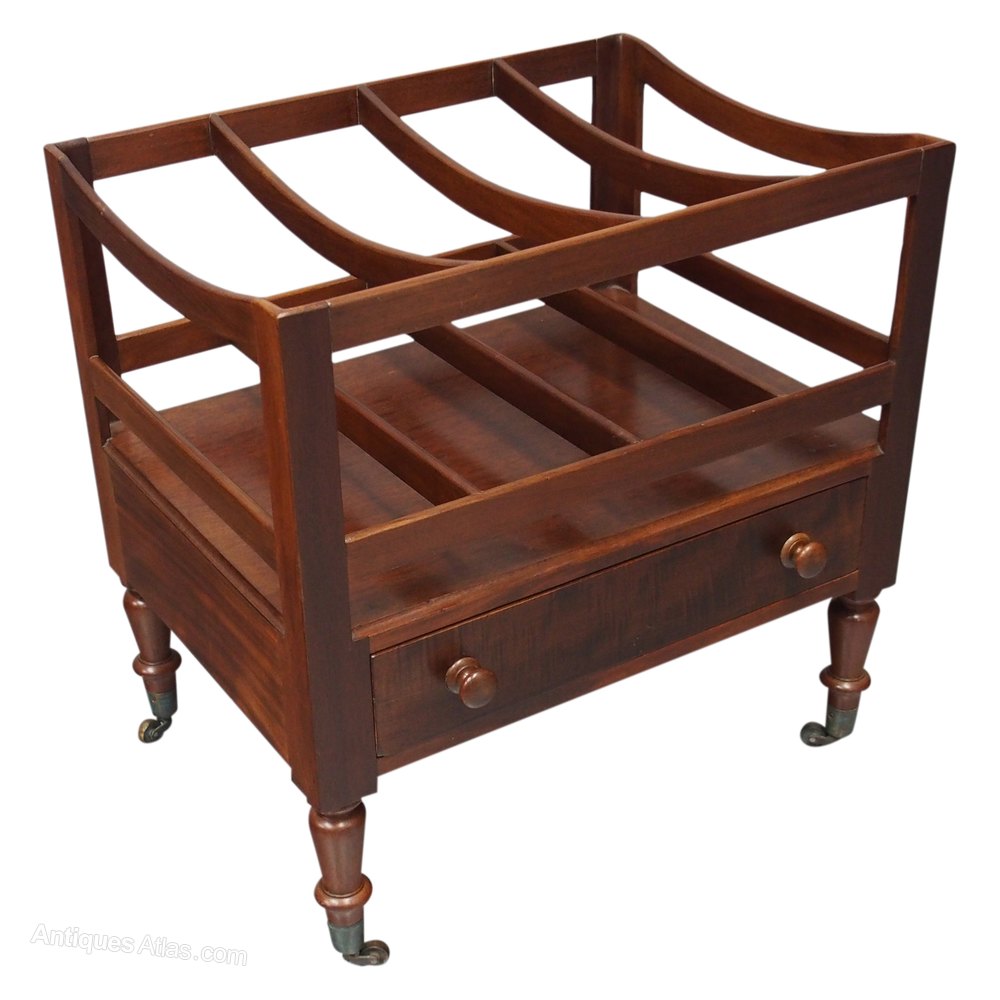 Circa 1830, George IV freestanding mahogany canterbury. The four divisions with curved tops, and central section held in place by L shaped uprights, above a simple moulded edge. The full length, ash lined drawer (indicating it is Scottish) has figuring to the facings and turned mahogany knobs, all standing on turned and tapering classic George IV legs, finishing on brass cups and brass castors.