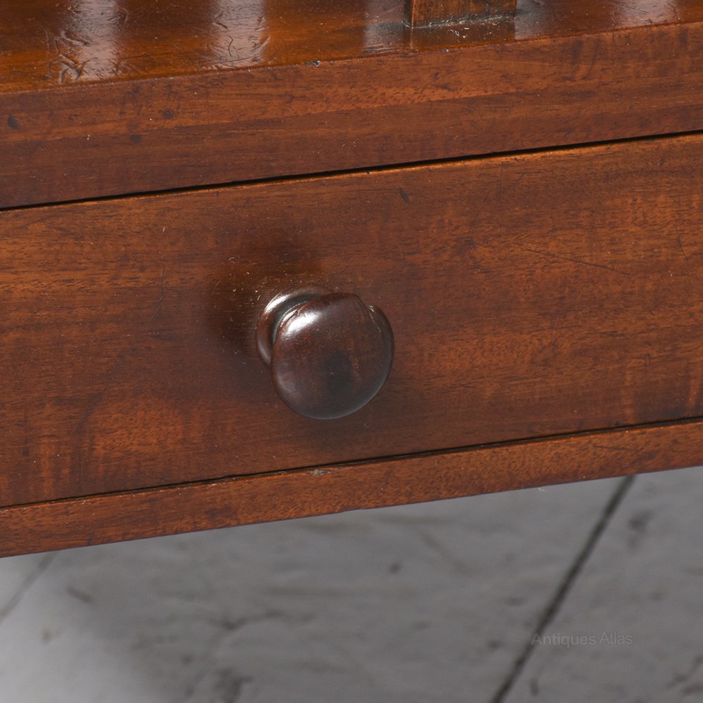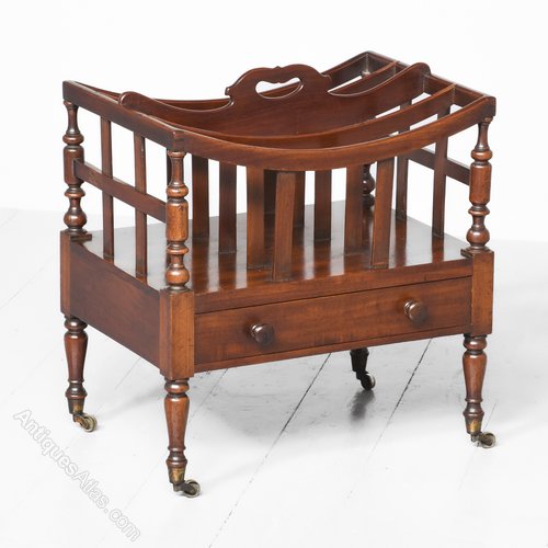 Circa 1820. A good George IV mahogany four division Canterbury. The boat shaped Canterbury with cut out lifting handle to the center, each of the divisions are separated by thin and elegant rectangular splats. With a polished base and a full-length drawer two turned knob handles, polished on all sides making it free standing, all resting on four elegant turned and tapering legs finishing with a brass cup and brass castors beneath.