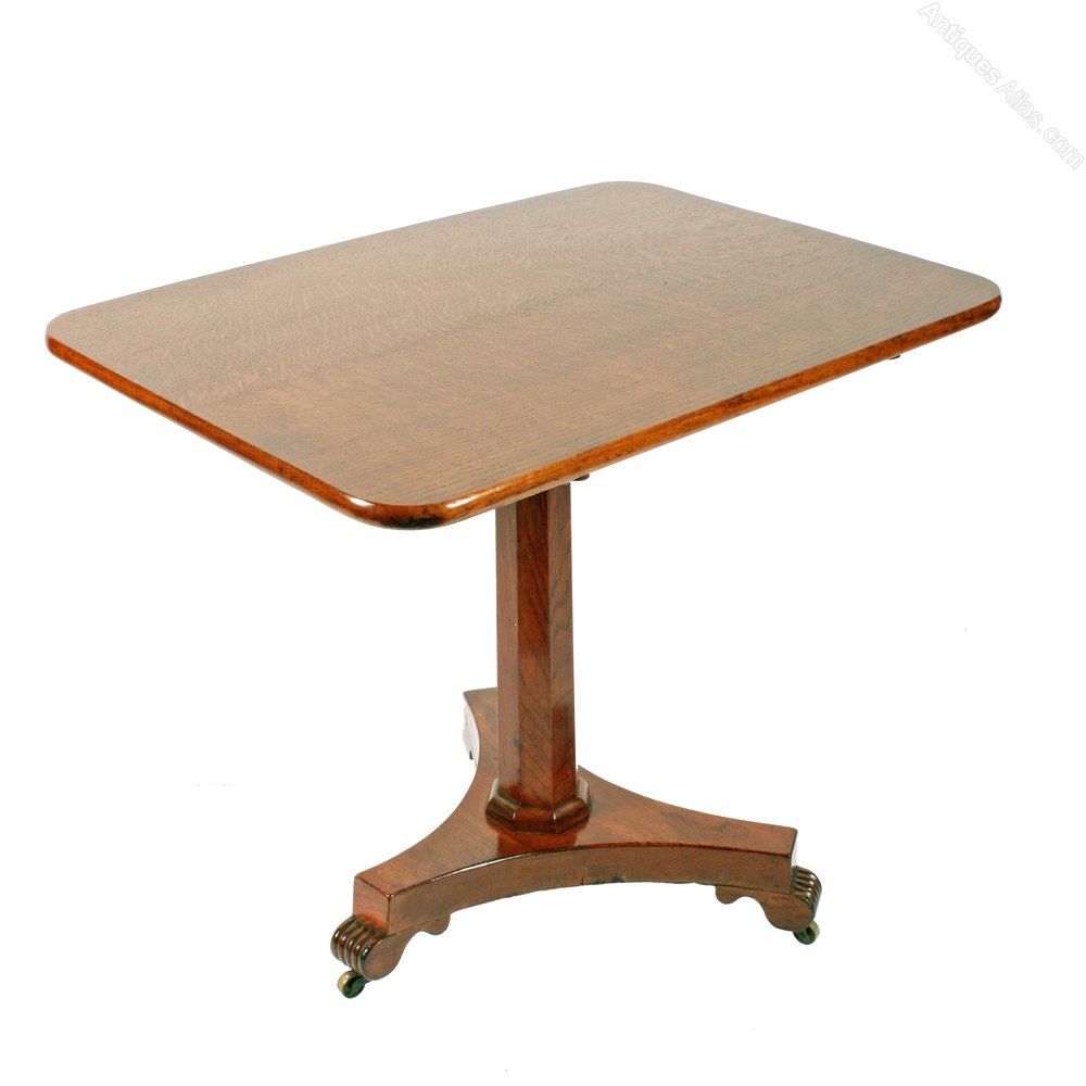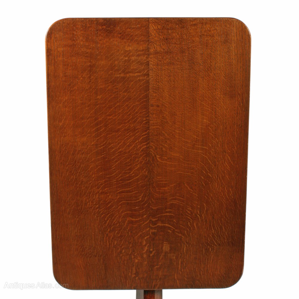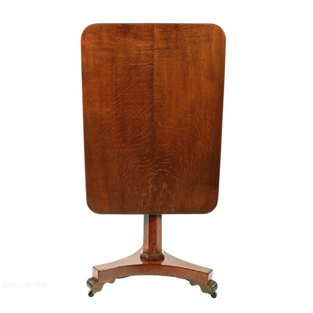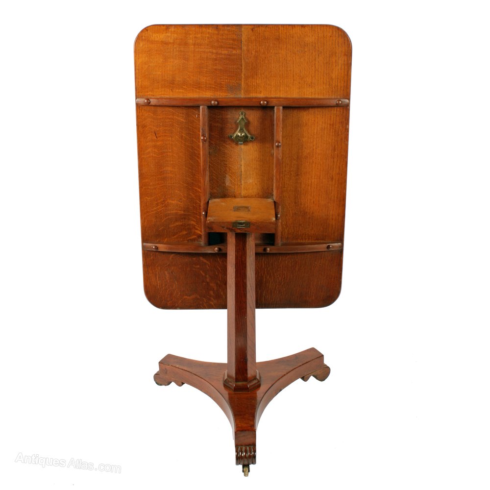 The table has an oblong top with a rounded edge and a brass release catch underneath that allows the top to tip.