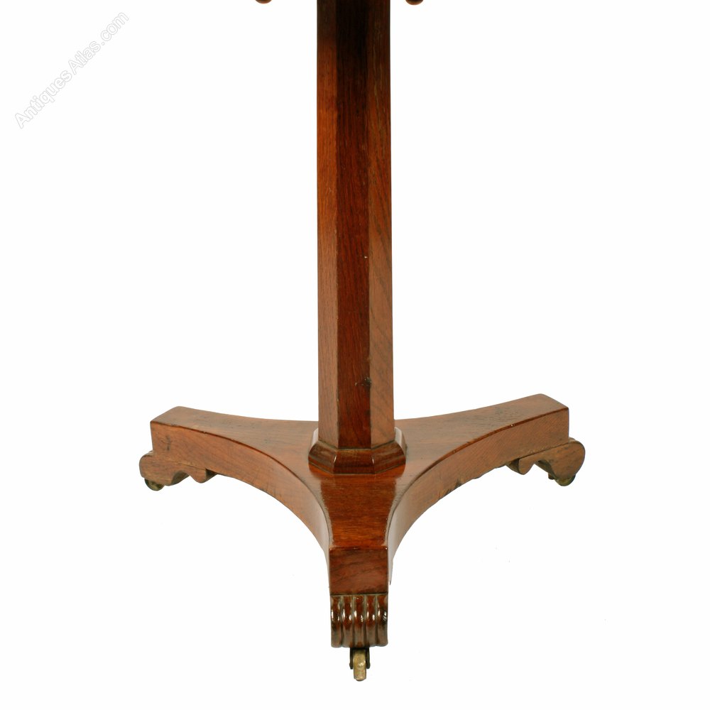 The table has a hexagonal column support that has a collar at the bottom and stands on a platform base with scroll feet and concealed casters.