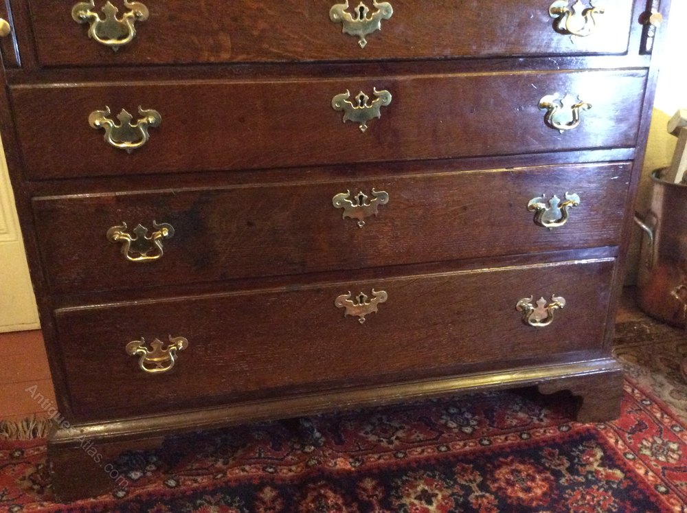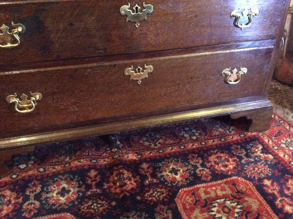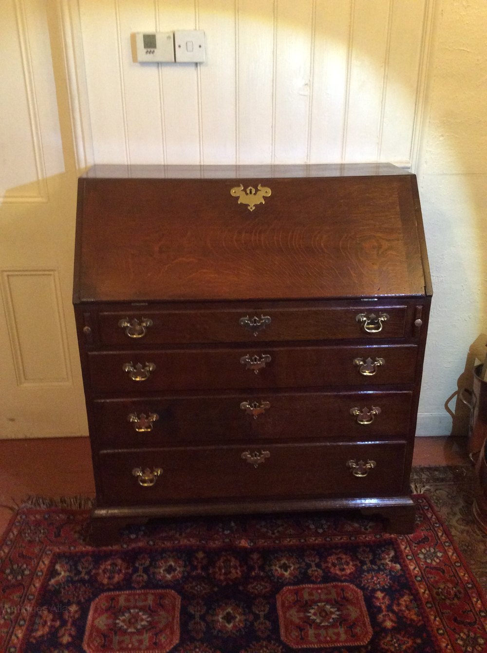A good example of an English Georgian Oak Bureau. Enclosed fitted interior with 12 fitted drawers, 6 pigeon holes and 1 central locking cupboard. Over four graduated drawers on ogee bracketed feet.