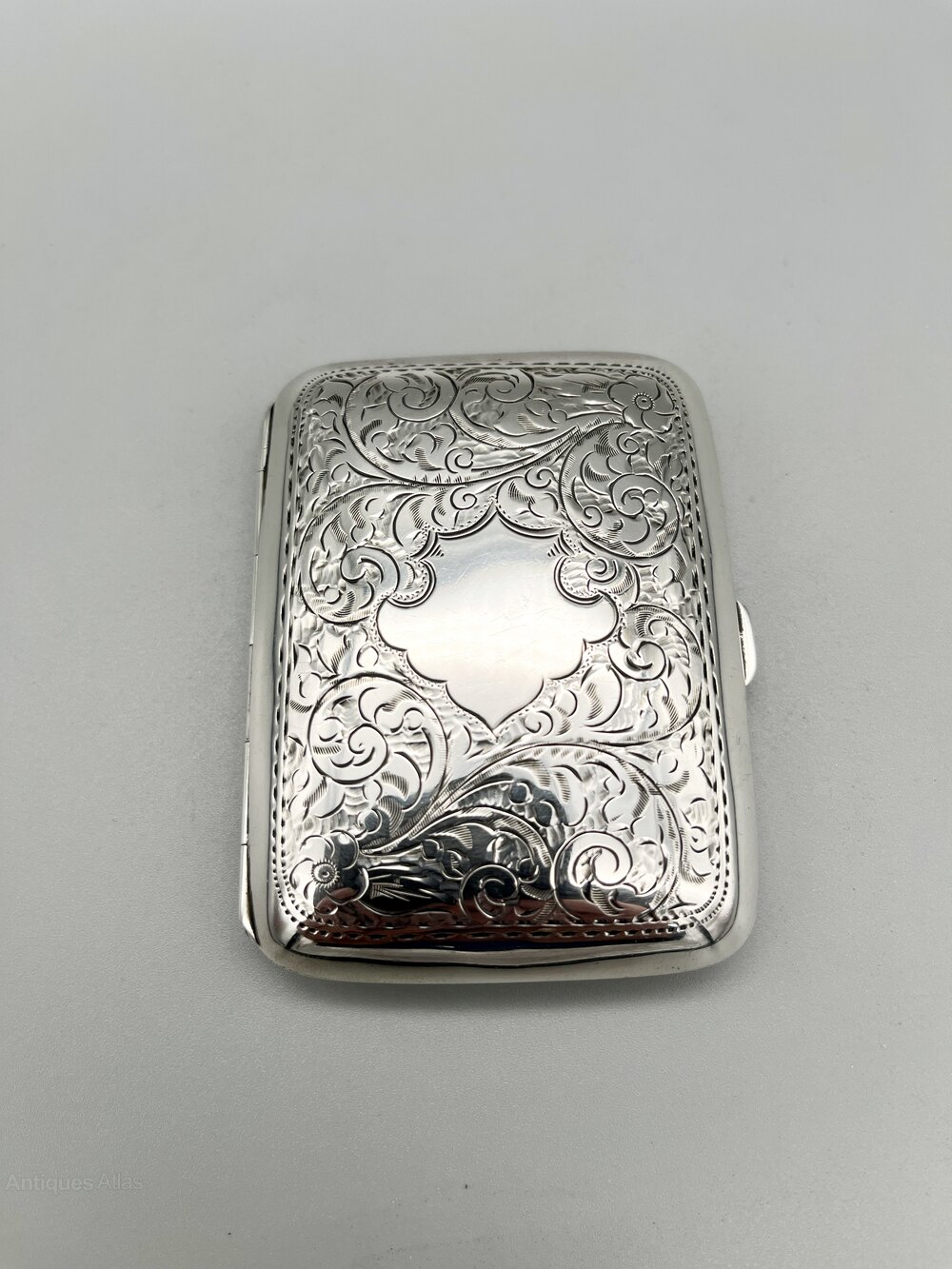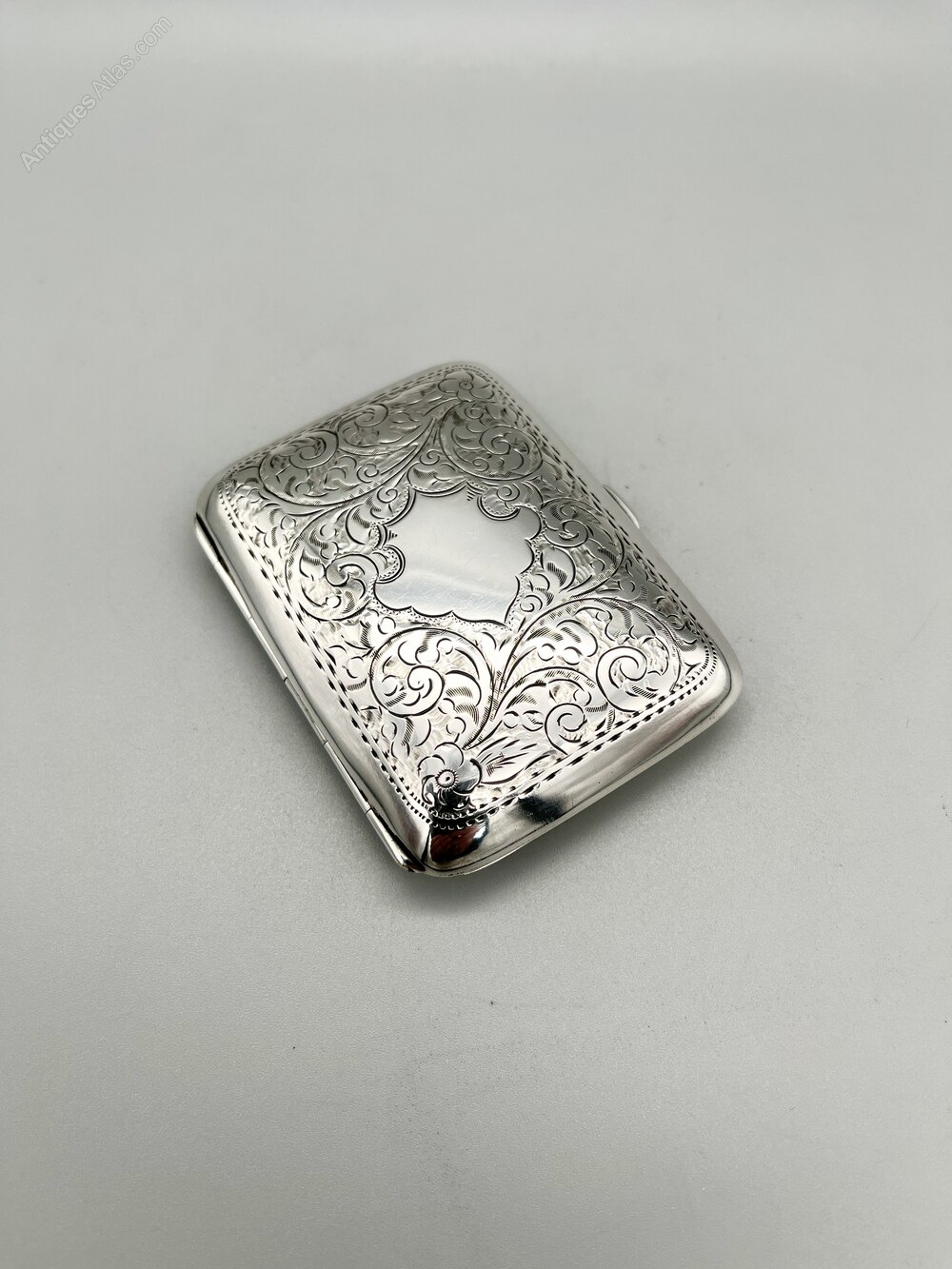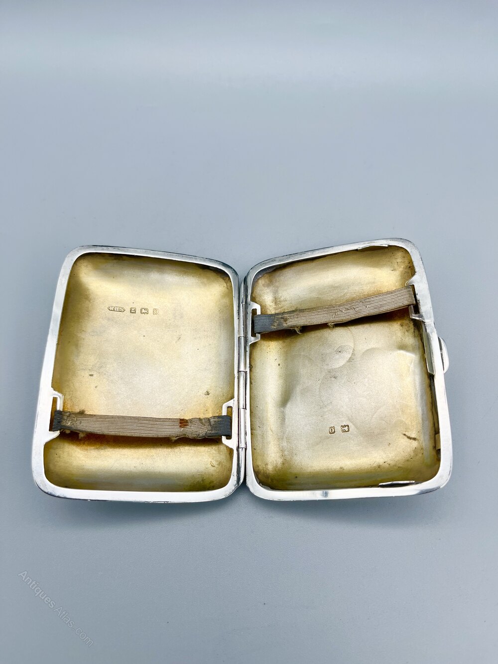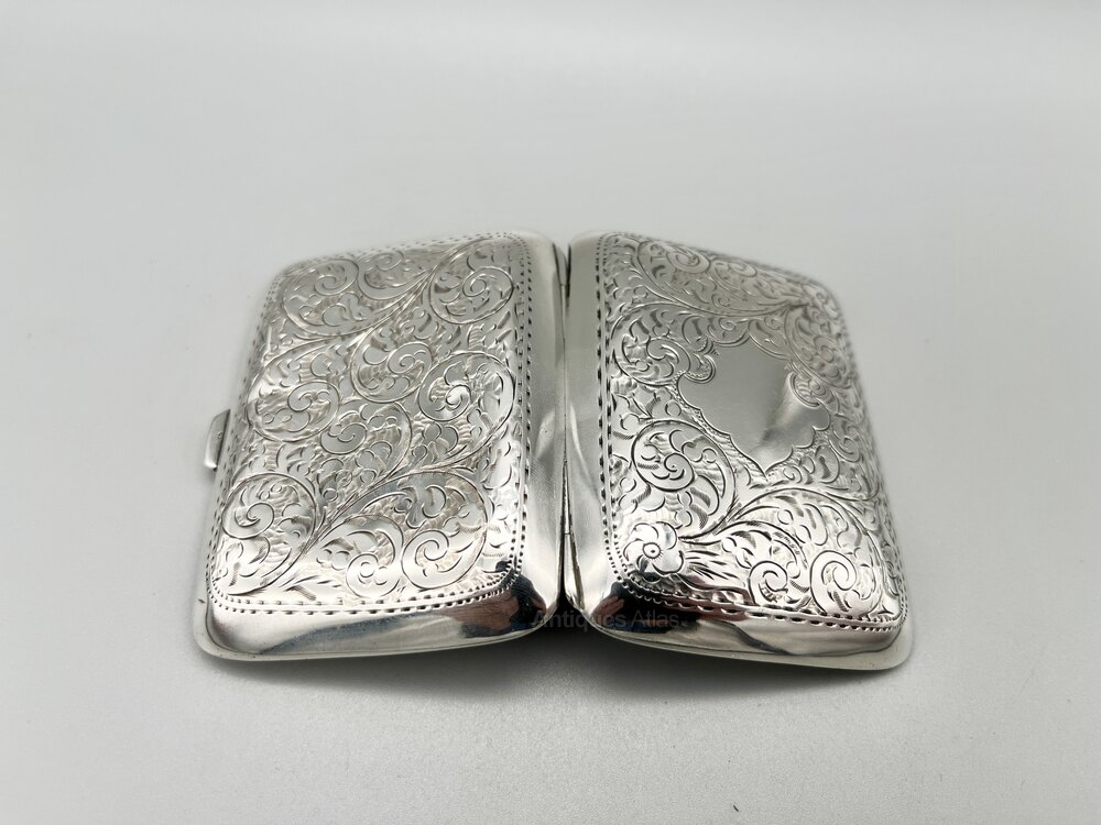 The cigarette case is 8.2cm / 3.2ins by 6cm / 2.3ins and 1.5cm / 0.59ins deep. It weighs in at a very respectable 54.0g / 1.9oz of solid Sterling Silver.