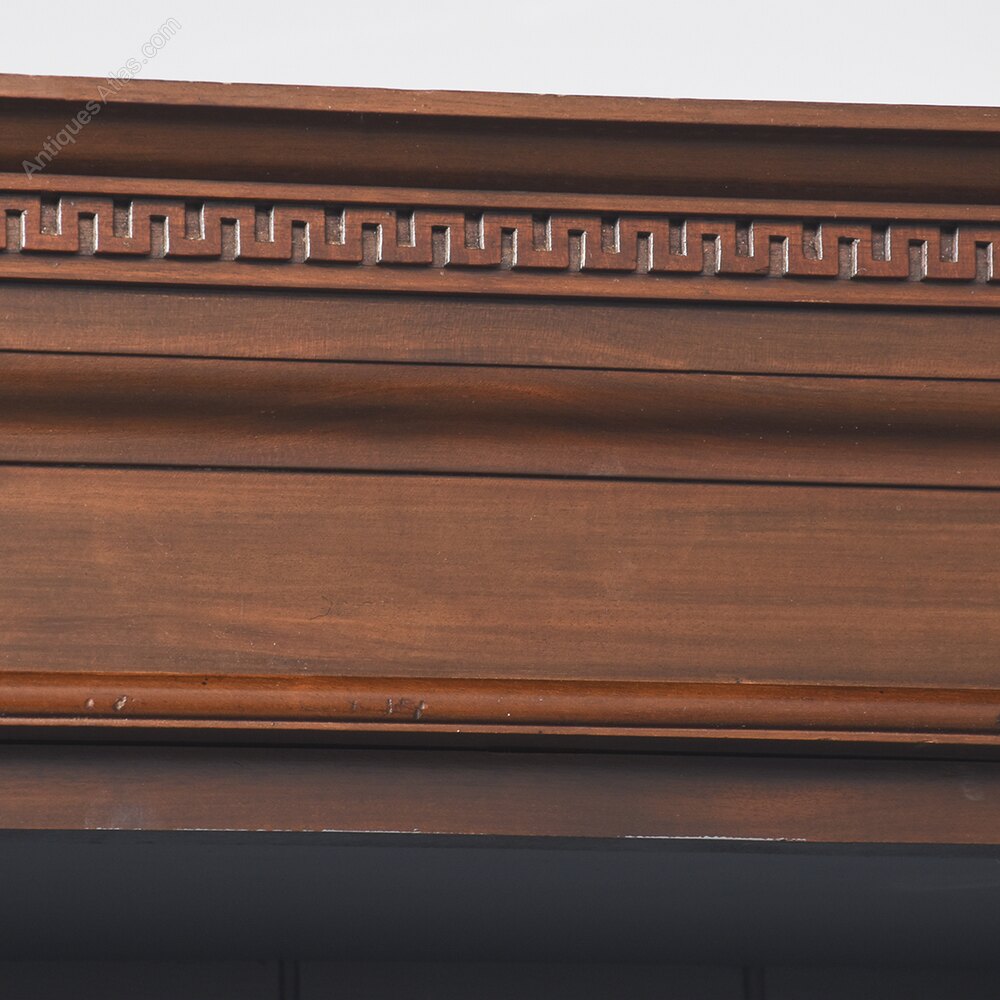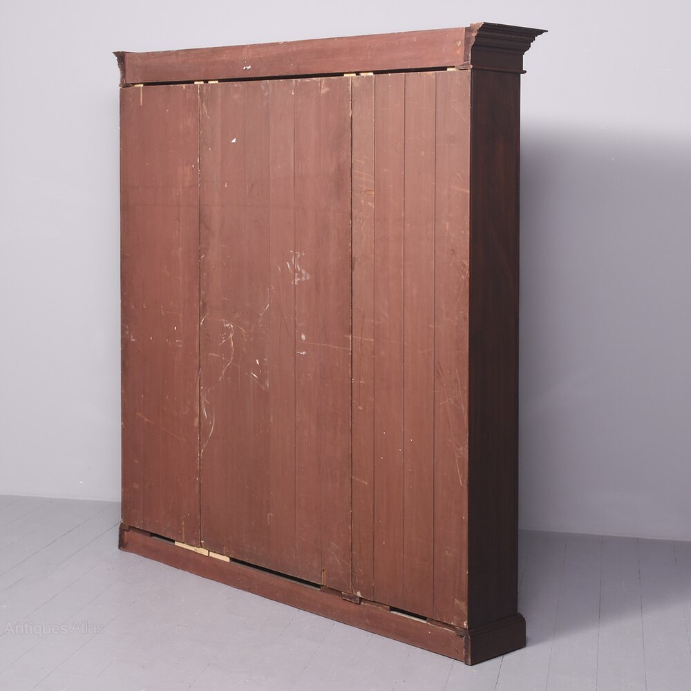 Circa 1880 with adaptations. Late Victorian tall mahogany open bookcase with clean lines. Surmounted by a Greek key cornice and a simple frieze, the three bookcase sections (wider in the middle) separated and flanked by vertical mahogany columns and each with four adjustable shelves, all sitting on an enclosed plinth base. In excellent condition.